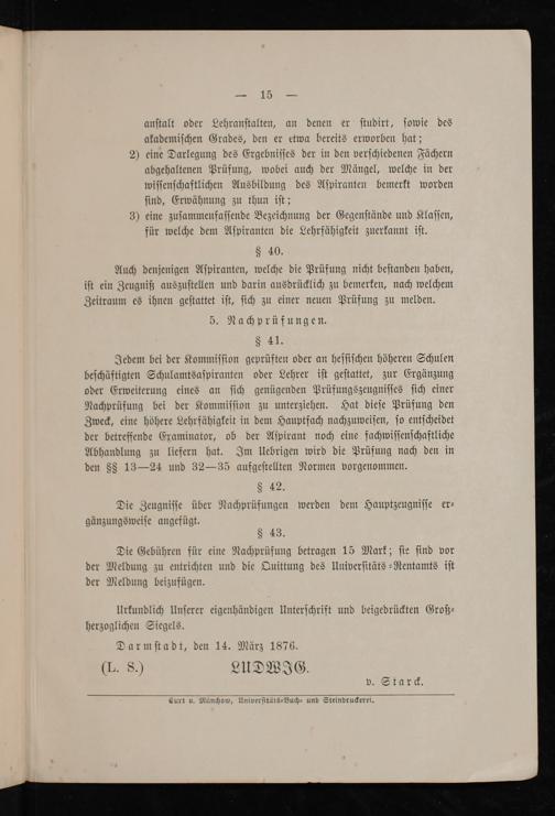 Verordnung, die Prüfungen der Aspiranten des Gymnasial- und Realschul-Lehramts betreffend : (Abdruck aus dem Großherzoglich Hessischen Regierungsblatt Nr. 17 vom 3. April 1876, 1180 Nr. 26 und 1886 Nr. 22) / (L. S.) Ludwig, v. Starck