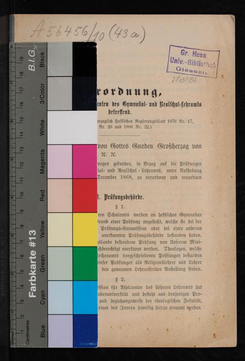 Verordnung, die Prüfungen der Aspiranten des Gymnasial- und Realschul-Lehramts betreffend : (Abdruck aus dem Großherzoglich Hessischen Regierungsblatt Nr. 17 vom 3. April 1876, 1180 Nr. 26 und 1886 Nr. 22) / (L. S.) Ludwig, v. Starck