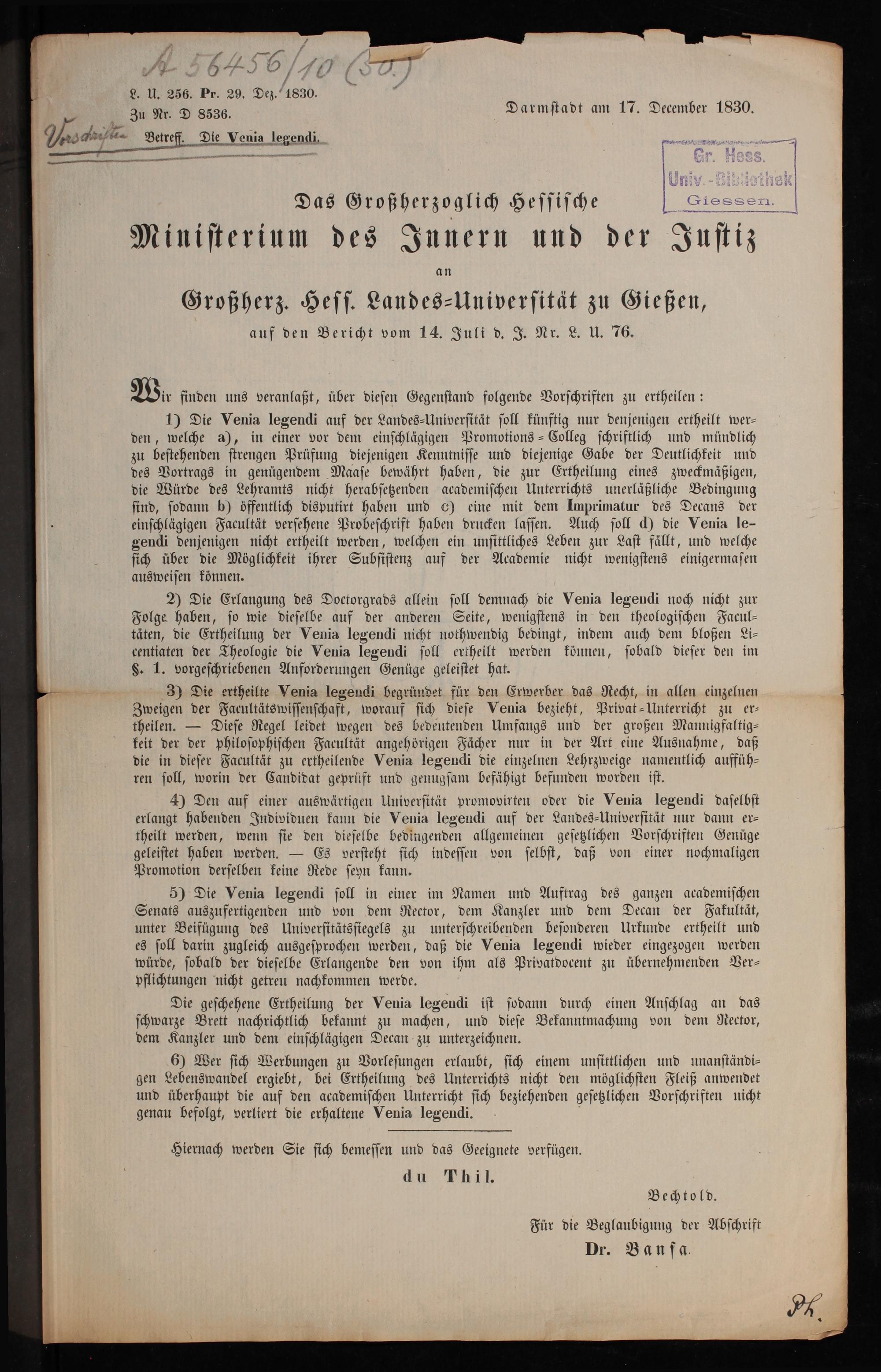 Das Großherzoglich Hessische Ministerium des Innern und der Justiz an Großherz. Hess. Landes-Universität zu Gießen auf den Bericht vom 14. Juli d. J. Nr. L. U. 76. / du Thil ; Bechtold ; Für die Beglaubigung der Abschrift Dr. Bansa
