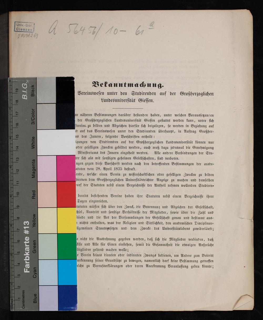 Bekanntmachung, betreffend: das Vereinswesen unter den Studirenden auf der Großherzoglichen Landesuniversität Giessen / Großherzogliches academisches Disciplinargericht