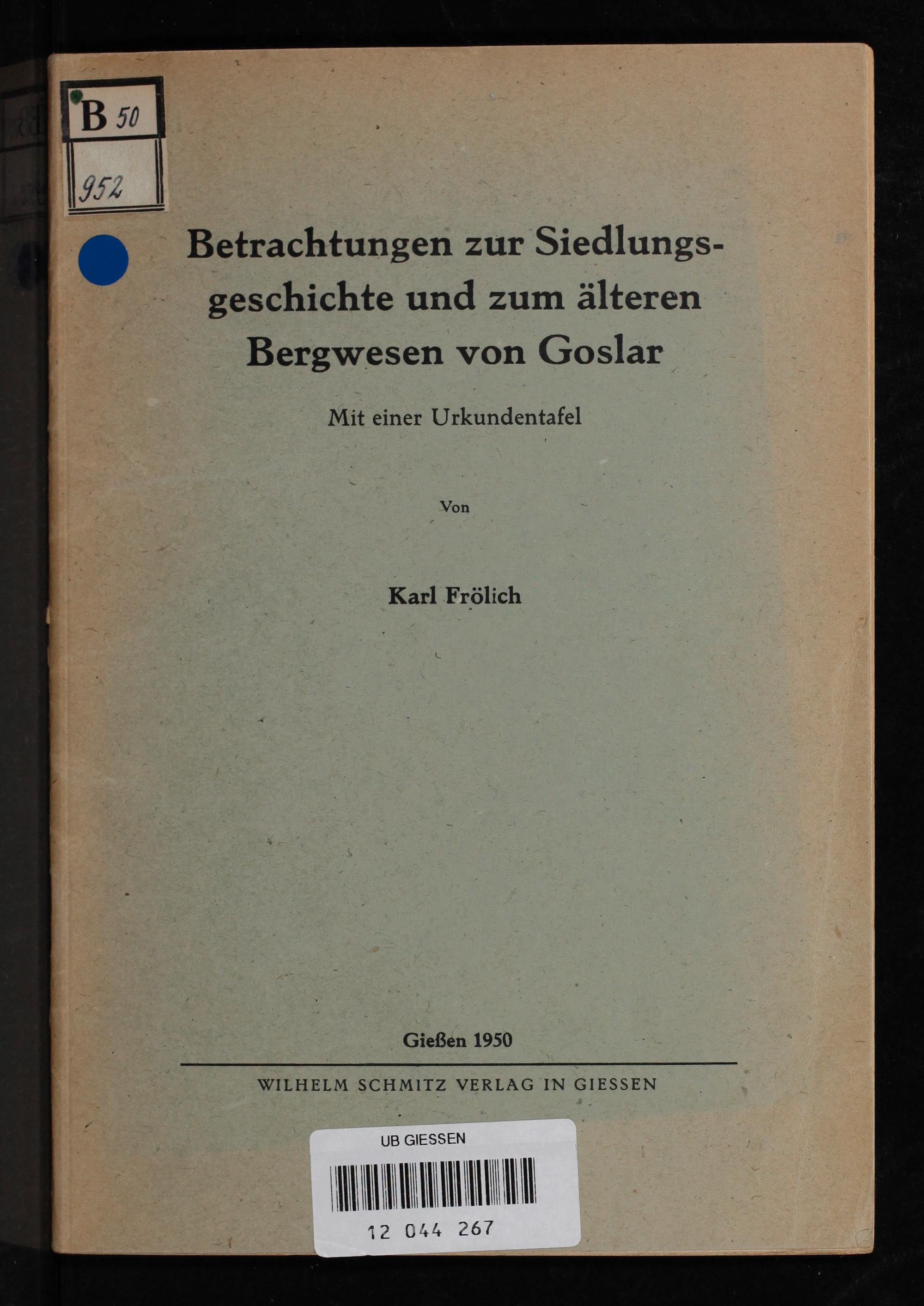 Betrachtungen zur Siedlungsgeschichte und zum älteren Bergwesen von Goslar ; mit einer Urkundentafel / von Karl Frölich