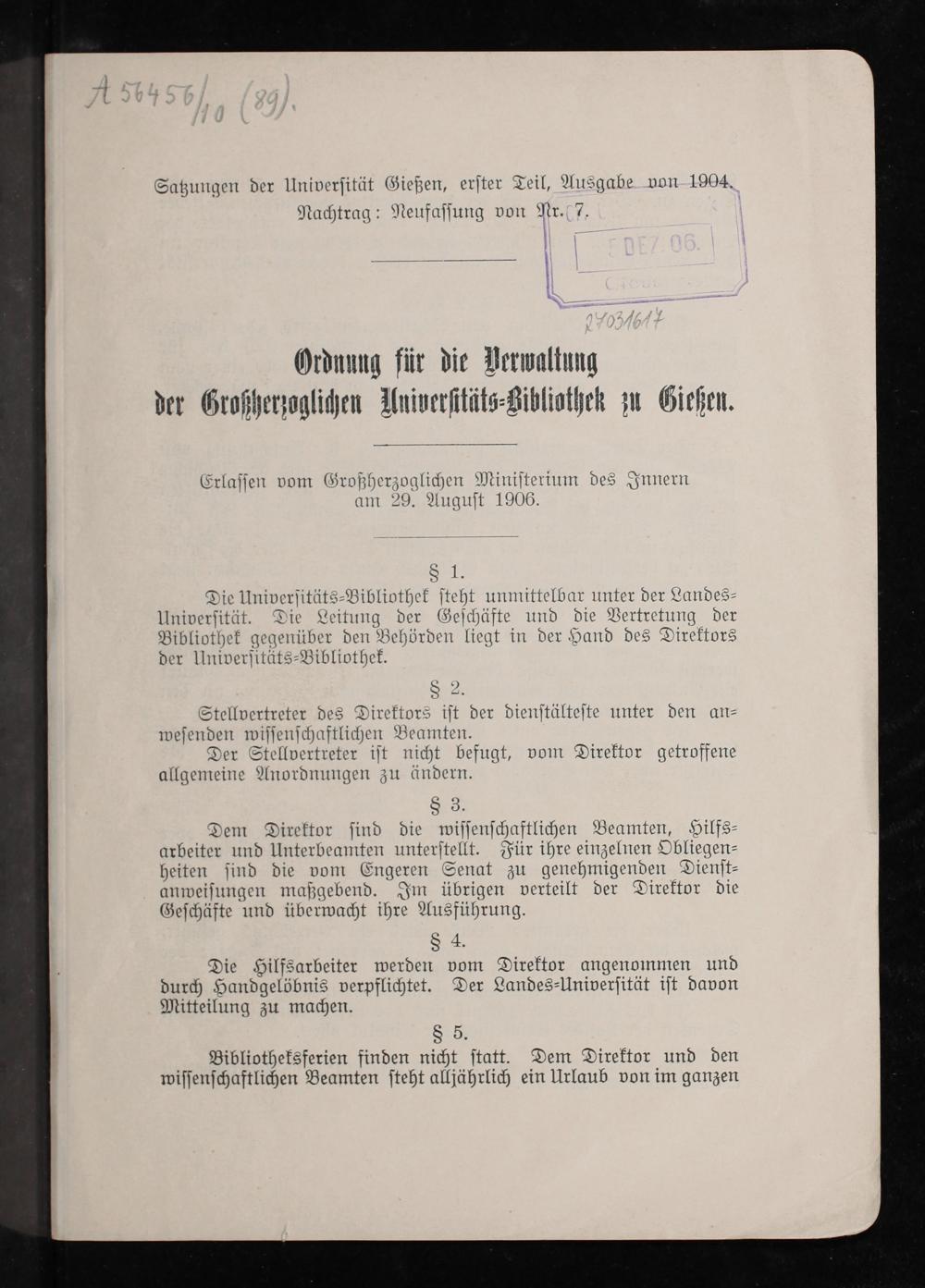 1. Teil, Ausgabe 1904, Nachtrag: Neufassung von Nr. 7 (1906) Ordnung für die Verwaltung der Großherzoglichen Universitäts-Bibliothek zu Gießen / erlassen vom Großherzoglichen Ministerium des Innern am 29. August 1906