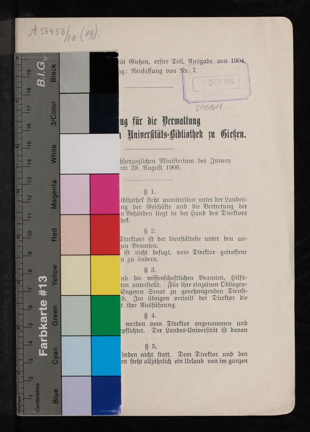 1. Teil, Ausgabe 1904, Nachtrag: Neufassung von Nr. 7 (1906) Ordnung für die Verwaltung der Großherzoglichen Universitäts-Bibliothek zu Gießen / erlassen vom Großherzoglichen Ministerium des Innern am 29. August 1906
