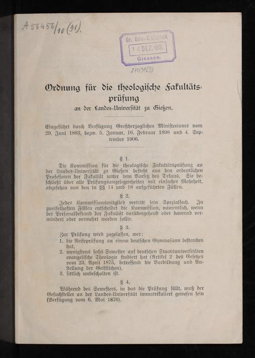 Ordnung für die theologische Fakultätsprüfung an der Landes-Universität zu Giessen : eingeführt durch Verfügung Großherzoglichen Ministeriums vom 29. Juni 1883, bezw. 5. Januar, 16. Februar 1898 und 4. September 1906
