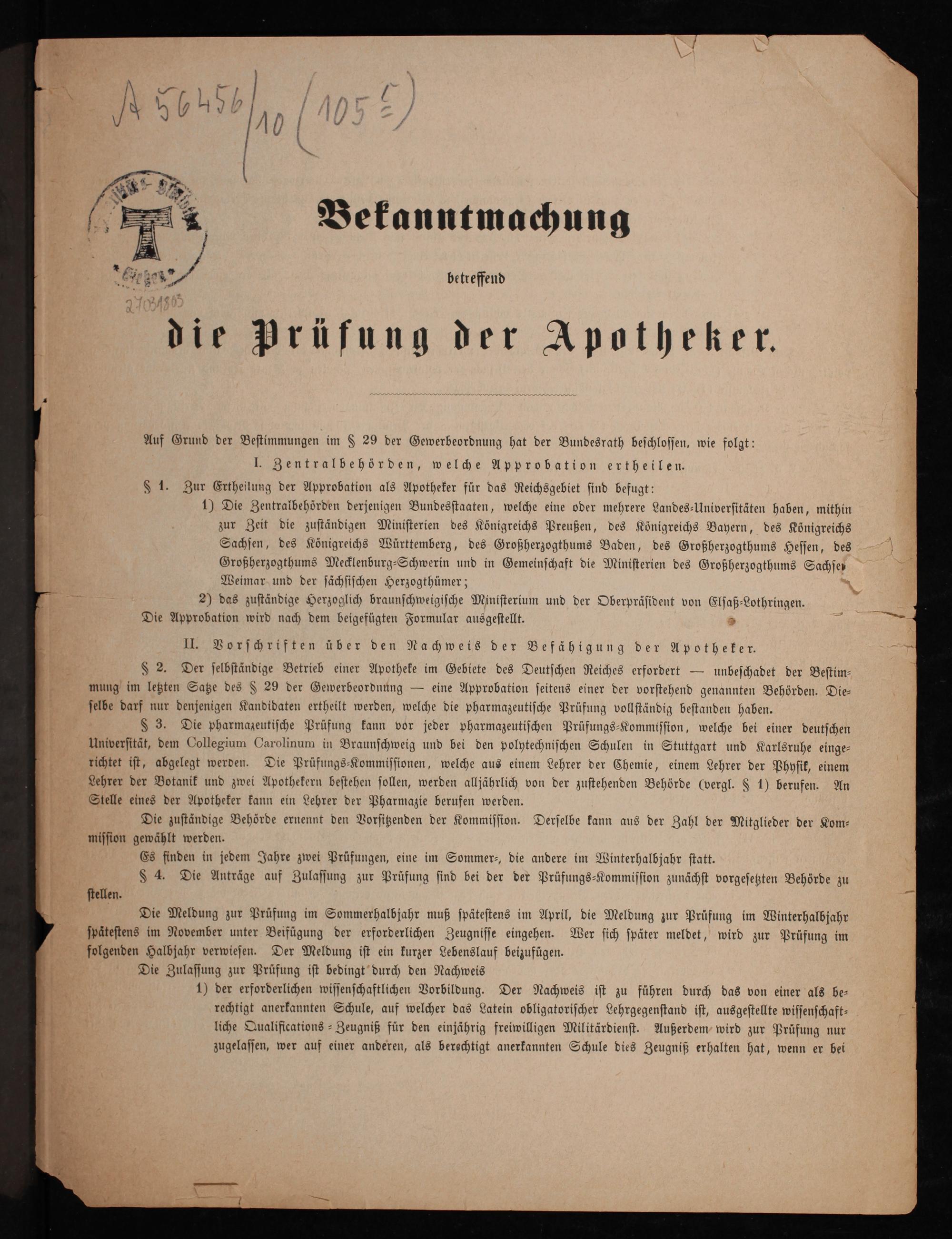 Bekanntmachung betreffend die Prüfung der Apotheker / der Reichskanzler : im Auftrage: E ck.