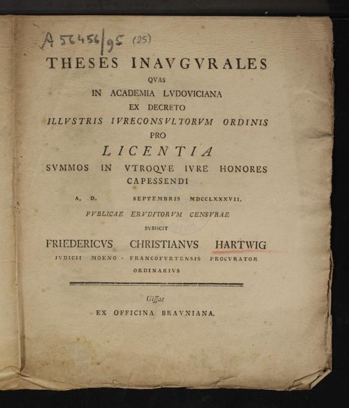 Theses Inavgvrales Qvas In Academia Lvdoviciana Ex Decreto Illvstris Ivreconsvltorvm Ordinis Pro Licentia Svmmos In Vtroqve Ivre Honores Capessendi A. D. Septembris MDCCLXXXVII. / Pvblicae Ervditorvm Censvrae Svbiicit Friedericvs Christianvs Hartwig Ivdicii Moeno-Francofvrtensis Procvrator Ordinarivs