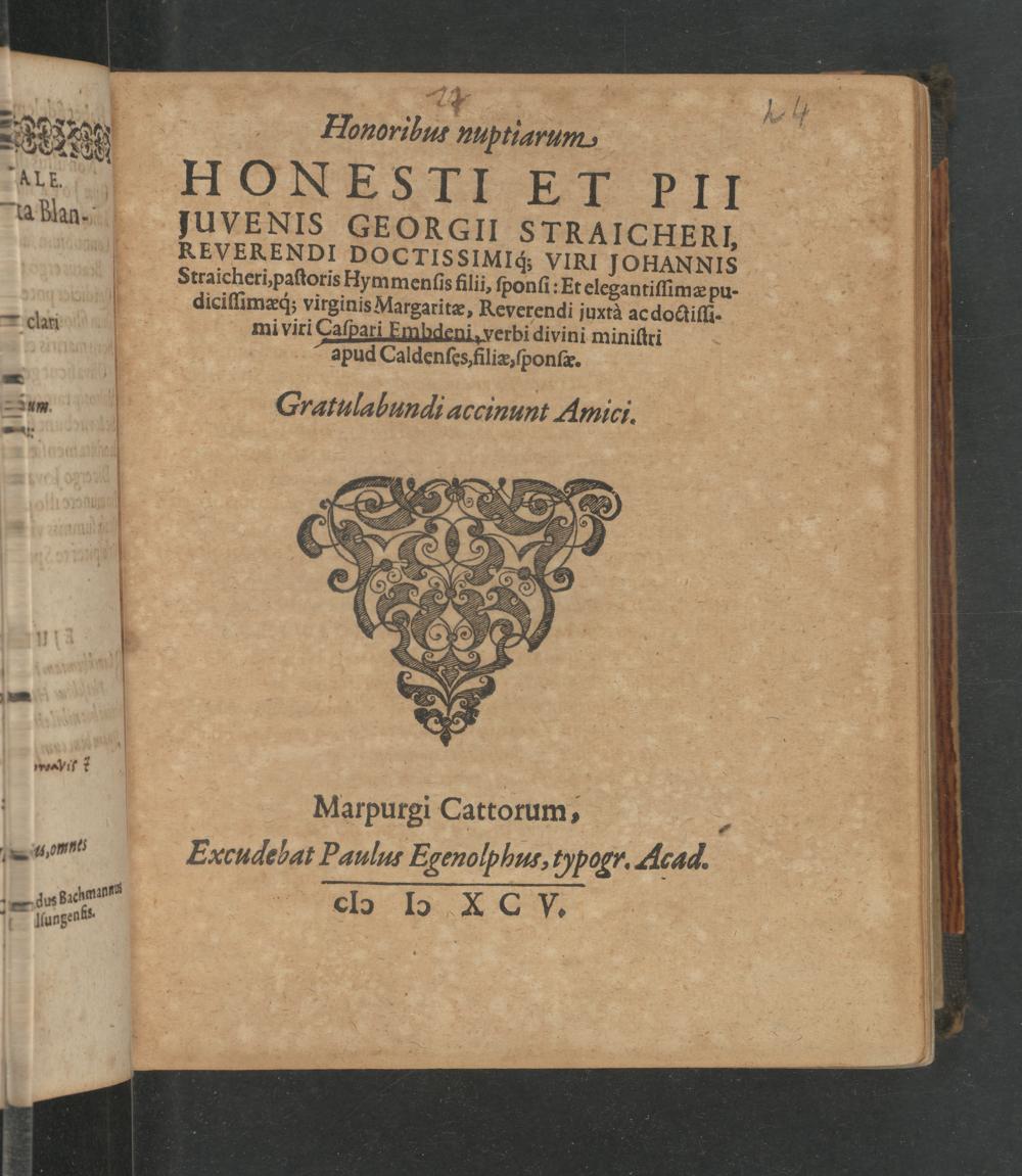 Honoribus nuptiarum Honesti Et Pii Juvenis Georgii Straicheri, Reverndi Doctissimiq[ue] Viri Johannis Straicheri, pastoris Hymmenis filii, sponsi: Et elegantissimæ pudicissimæq[ue] virginis Margaritæ, Reverendi juxtà ac doctissimi viri Caspari Embdeni, verbi divini ministri apud Caldenses, filiæ, sponsæ / Gratulabundi accinunt Amici [Rodolphus Goclenius Profess. Marp., Daniel Angelocrator Corbachiensis, Matthias Larmannus Caldensis]