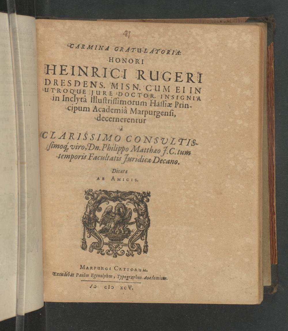 Carmina Gratulatoria: Honori Heinrici Rugeri Dresdens. Misn. Cum Ei In Utroque Jure Doctor. Insignia in Inclytâ Illustrissimorum Hassiæ Principum Academiâ Marpurgensi, decerenrentur / à Clarissimo Consvltissimoq[ue] viro, Dn. Philippo Matthæo J.C. tum temporis Facultatis Juridicæ Decano ; Dicata Ab Amicis [Rodolphus Goclenius in illustri Academiâ Marpurgensis Profess. Log., Herm. Kirchnerus Poëta Cæsar. coron. Profess. Marpurg., Christianus Kegel Saxo, LL.St.]