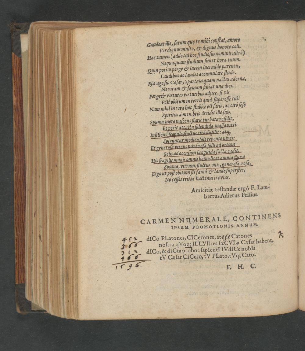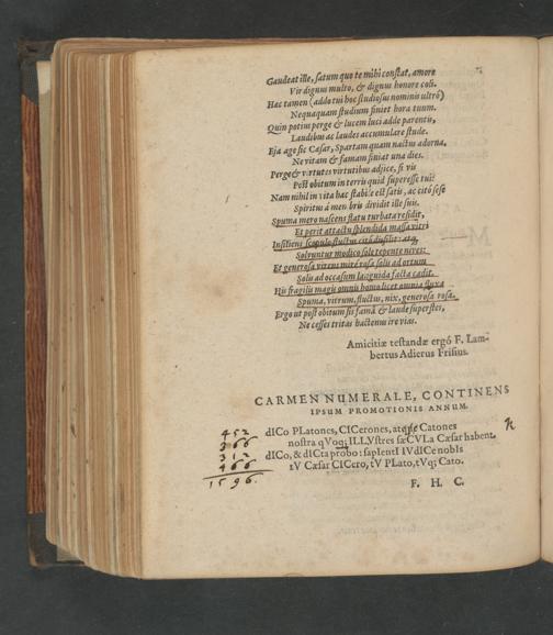 Laurea Magistralis In Honorem Doctiss. Juvenis Gerardi Caesarii Batavi : Cum in inclyta Cattorum Academia Philosophicarum artium Magister crearetur / Missa Ab Amicis E Schola Sigenensi Nassovia [Gratulabundus F. Tobias Rivius, F. Henricus Copius Clivo-Vesalius, F. Henricus Kaldenvs Vesalius, F. Lambertus Adierus Frisius]