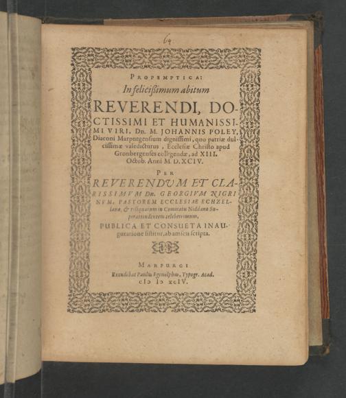Propemptica: In felicißimum abitum Reverendi, Doctissimi Et Humanissimi Viri, Dn. M. Johannis Poley, Diaconi Marpurgensium dignissimi, quo patriæ dulcissimæ valedicturus, Ecclesiæ Christo apud Gronbergenses colligendæ, ad XIII. Octob. Anni M.D.XCIV. / Per Reverendum Et Clarissimvm Dn. Georgivm Nigri Nvm, Pastorem Ecclesiæ Echenzellanæ, & reliquarum in Comitatu Niddano Super attendentem celeberrimum, Publica Et Consueta In Auguratione sistitur, ab amicis scirpta [M. Johannes Ursinus, M. Johannes Vietor Alsfeldianus Hassus, M. Johannes Theodoricvs Gemundensis, H.]