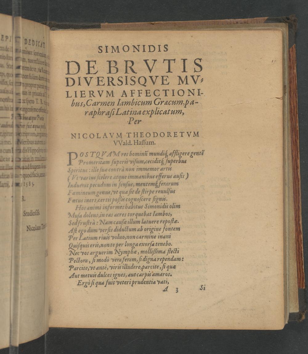 De Mvliervm Diversis Brvtisqve Affectionibvs, Simonidis carmen lambicum Græcum, paraphrasi Latina explicatum / Per Nicolavm Theodoretum Vvald. Hassum.