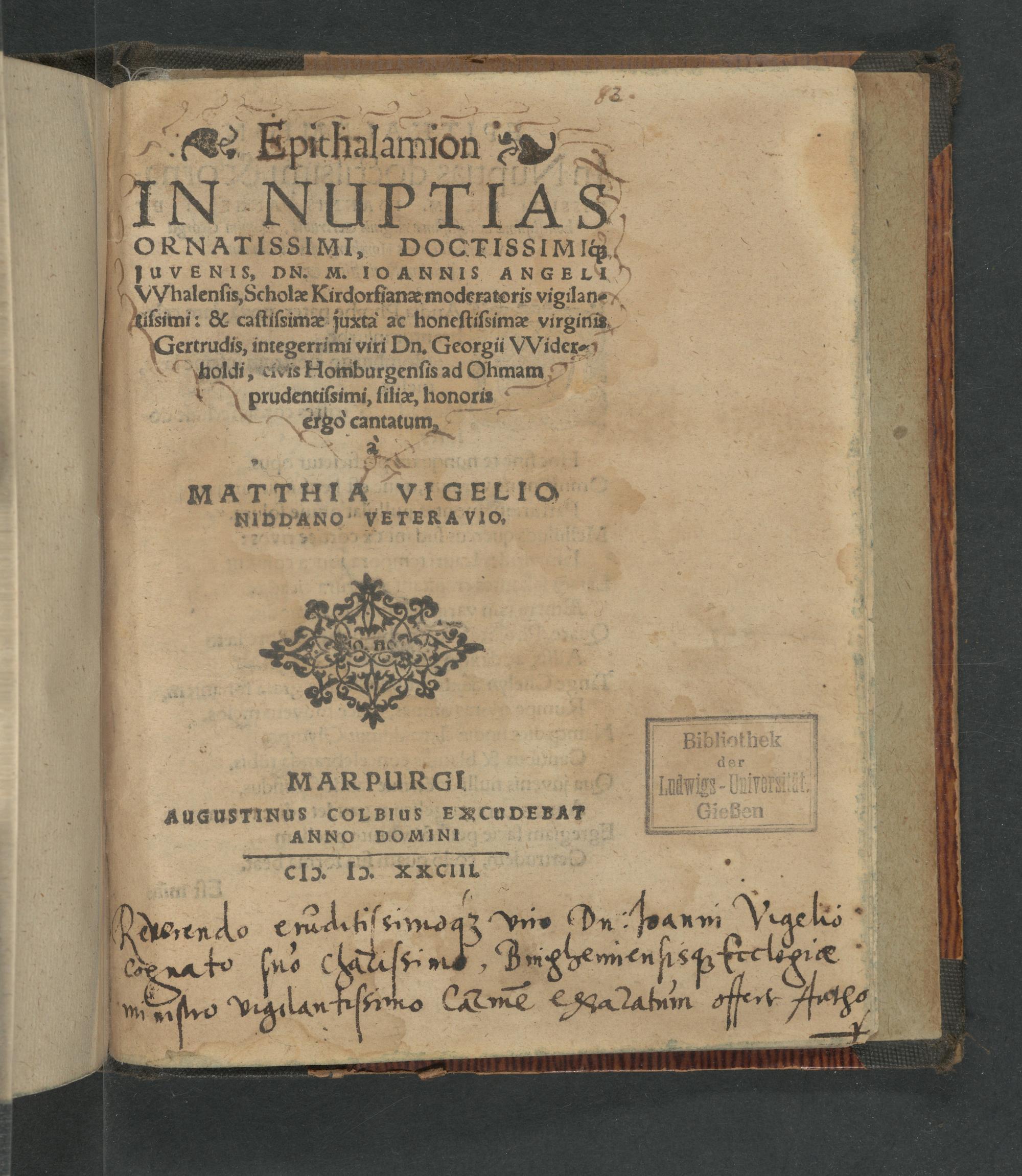 Epithalamion In Nuptias Ornatissimi, Doctissimiq[ue] Juvenis Dn. M. Iohannis Angeli Vvhalensis, Scholæ Kirdorfianæ moderatoris vigilantissimi: & castissimæ juxta ac honestissimæ virginis Gerturdis, integerrimi viri Dn. Gerogii Vviderholdi, civis Homburgenis ad Ohmam prudentissimi, filiæ, honoris / ergò cantatum à Matthia Vigelio Niddano Veteravio