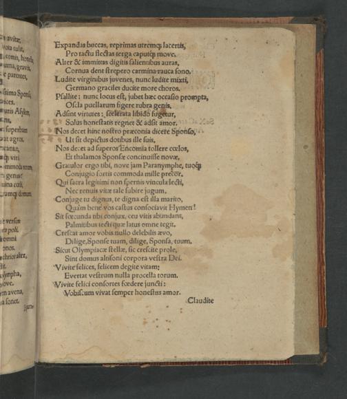 Epithalamion In Nuptias Ornatissimi, Doctissimiq[ue] Juvenis Dn. M. Iohannis Angeli Vvhalensis, Scholæ Kirdorfianæ moderatoris vigilantissimi: & castissimæ juxta ac honestissimæ virginis Gerturdis, integerrimi viri Dn. Gerogii Vviderholdi, civis Homburgenis ad Ohmam prudentissimi, filiæ, honoris / ergò cantatum à Matthia Vigelio Niddano Veteravio