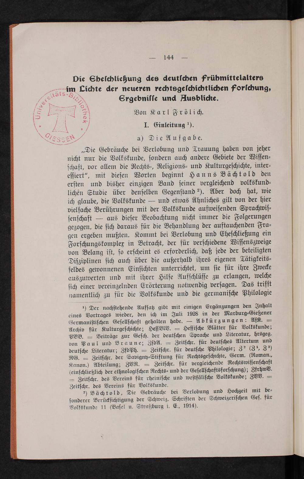 Die Eheschließung des deutschen Frühmittelalters im Lichte der neueren rechtsgeschichtlichen Forschung, Ergebnisse und Ausblicke / von Karl Frölich
