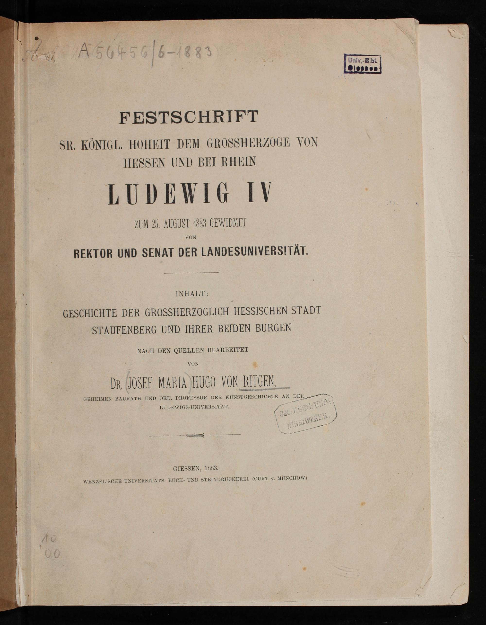 Geschichte der großherzoglich hessischen Stadt Staufenberg und ihrer beiden Burgen : Festschrift sr. Königl. Hoheit dem Großherzoge von Hessen und bei Rhein Ludewig IV zum 25. August 1883 gewidmet von Rektor und Senat der Landesuniversität / nach den Quellen bearbeitet von Josef Maria Hugo von Ritgen