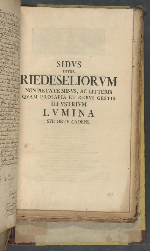 Sidvs Inter Riedeseliorvm Non Pietate Minvs, Ac Litteris Qvam Prosapia Et Rebvs Gestis Illvstrivm Lvmina Svb Ortv Cadens