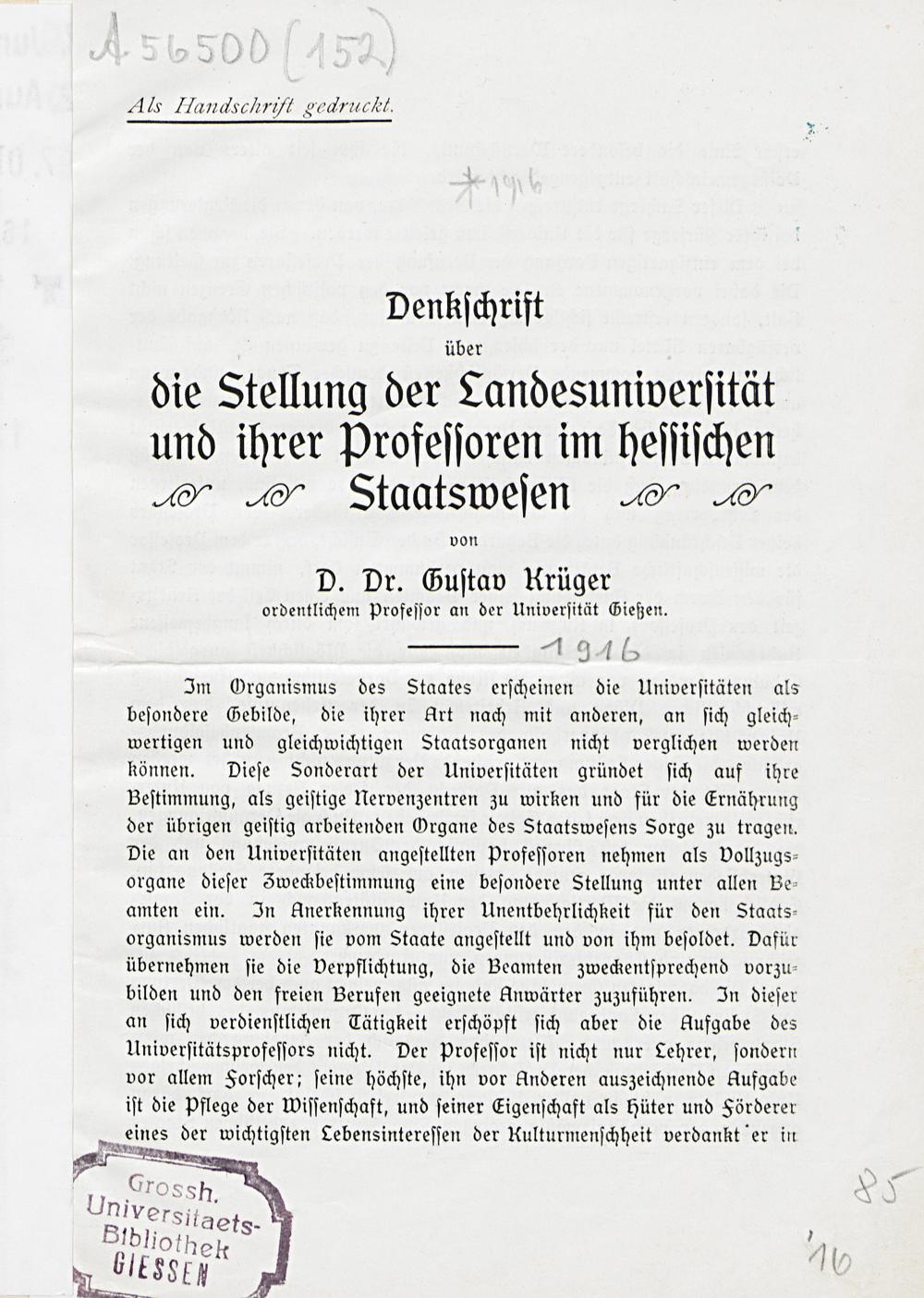 Denkschrift über die Stellung der Landesuniversität und ihrer Professoren im hessischen Staatswesen / Gustav Krüger