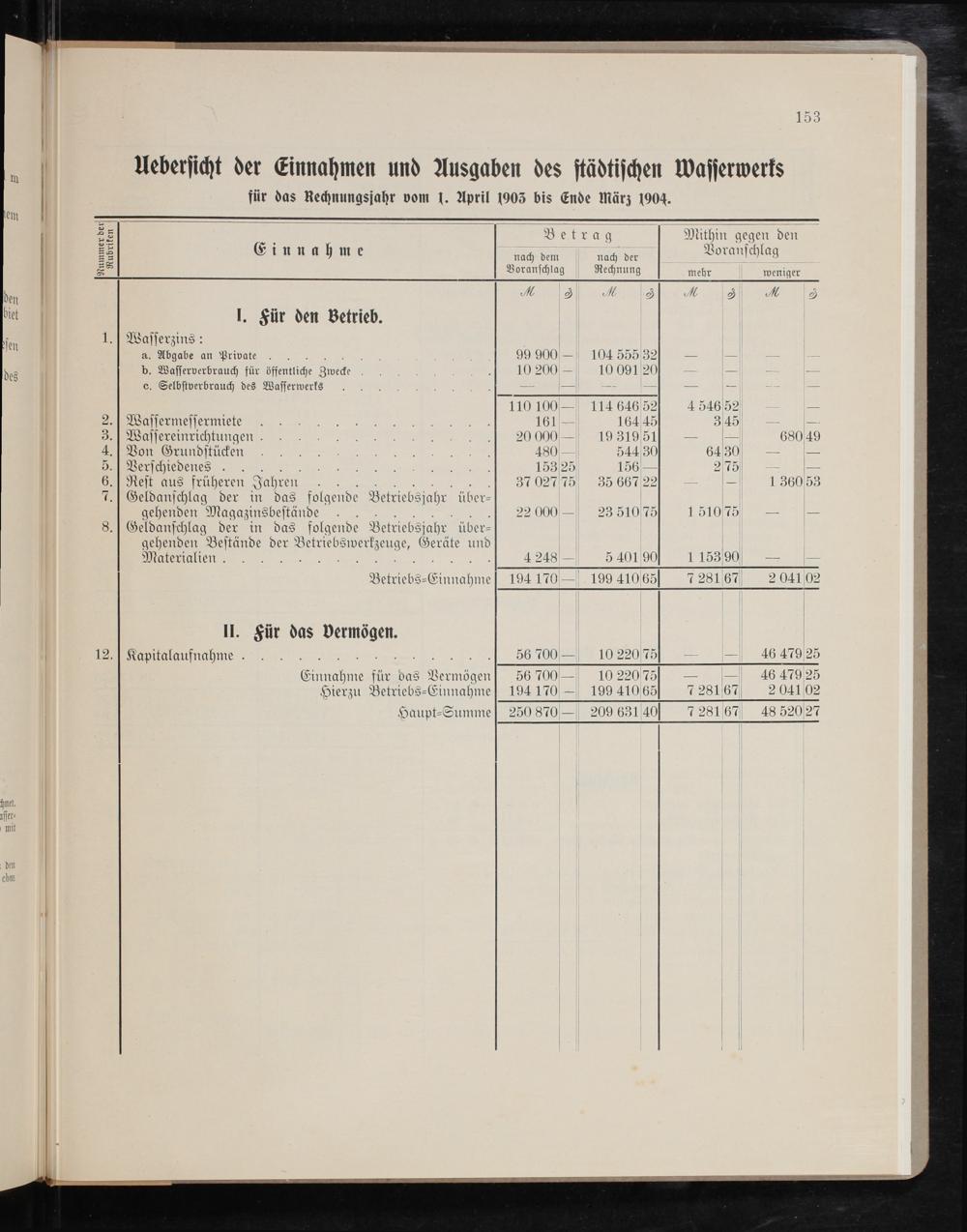 N ö 5 15 5 1 Uebersicht der Einnahmen und Ausgaben des städtischen Wasserwerks für das Rechnungsjahr vom 1. April 1005 bis Ende März 1904. fen xxxñĩx7j: Uö1Α¶̃⁶x%3%hDãñüä——— Were g Mithin gegen den 7 7 N E inn a 0 me nach dem nach der Voranschlag Voranschlag Rechnung mehr weniger den 2 2 9. 0 72 9 biet I. Für den Betrieb. dien 1.] Wasserzins: a. Abgabe an Private 3535 99 900— 104 555 32 5 des b. Wasserverbrauch für öffentliche Zwecke n. 10 200— 1009120— c. Selbstverbrauch des Wasserwerks 88 2 . 110 100 114 6465 4546052 l 2.] Wassermessermiete 161 16445 345 8 3.] Wassereinrichtungen. 20 000— 19 319051— 68049 4.] Von Grundstücken 480 54430 6430 ä TTT 15325 1560 275— ieh 8 7 02775 35 66722— 136053 7.] Geldanschlag der in das folgende Betriebsjahr über— f gehenden Magazinsbestände»t 900 23 510.75 Si=— 8.] Geldanschlag der in das folgende Betriebsjahr über— gehenden Bestände der Betriebswerkzeuge, Geräte und Materialien. 1 5 4248— 5 40190 1153090— Betriebs-Einnahme] 194 170 199 41065 728167 2 04102 II. Für das vermögen. 12.] Kapitalaufnahme n. 1 56 700— 10 22075 46 47925 Einnahme für das Vermögen 56 700— 10 22075—— 46 47925 Hierzu Betriebs-Einnahme] 194 170— 199 41065 7281067 204102 Haupt⸗Summe] 250 870— 209 63140 7281067 48 520027 net, lsser⸗ mit den chm