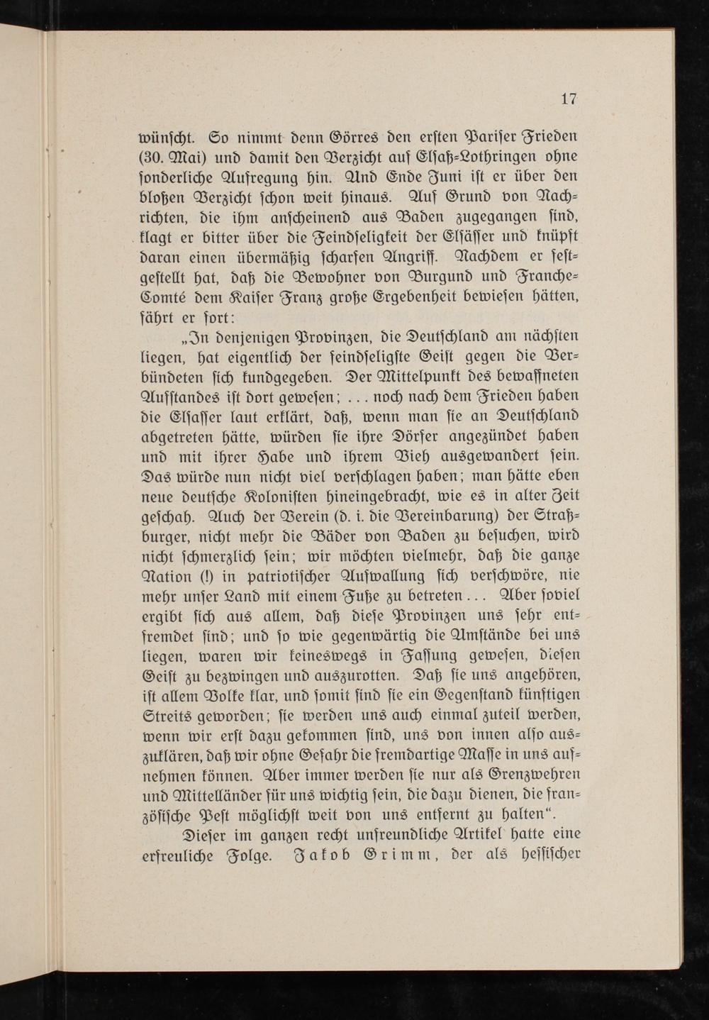 „In denjenigen Provinzen, die Deutſchland am nächſten liegen, hat eigentlich der feindſeligſte Geiſt gegen die Ver— bündeten ſich kundgegeben. Der Mittelpunkt des bewaffneten Aufſtandes iſt dort geweſen;... noch nach dem Frieden haben die Elſaſſer laut erklärt, daß, wenn man ſie an Deutſchland abgetreten hätte, würden ſie ihre Dörfer angezündet haben und mit ihrer Habe und ihrem Vieh ausgewandert ſein. Das würde nun nicht viel verſchlagen haben; man hätte eben neue deutſche Koloniſten hineingebracht, wie es in alter Zeit geſchah. Auch der Berein(d. i. die Vereinbarung) der Straß⸗ burger, nicht mehr die Bäder von Baden zu beſuchen, wird nicht ſchmerzlich ſein; wir möchten vielmehr, daß die ganze Nation(h) in patriotiſcher Aufwallung ſich verſchwöre, nie mehr unſer Land mit einem Fuße zu betreten... Aber ſoviel ergibt ſich aus allem, daß dieſe Provinzen uns ſehr ent⸗ fremdet ſind; und ſo wie gegenwärtig die Amſtände bei uns liegen, waren wir keineswegs in Faſſung geweſen, dieſen Geiſt zu bezwingen und auszurotten. Daß ſie uns angehören, iſt allem Bolke klar, und ſomit ſind ſie ein Gegenſtand künftigen Streits geworden; ſie werden uns auch einmal zuteil werden, wenn wir erſt dazu gekommen ſind, uns von innen alſo aus⸗ zuklären, daß wir ohne Gefahr die fremdartige Maſſe in uns auf⸗ nehmen können. Aber immer werden ſie nur als Grenzwehren und Mittelländer für uns wichtig ſein, die dazu dienen, die fran⸗ zöſiſche Peſt möglichſt weit von uns entfernt zu halten“.