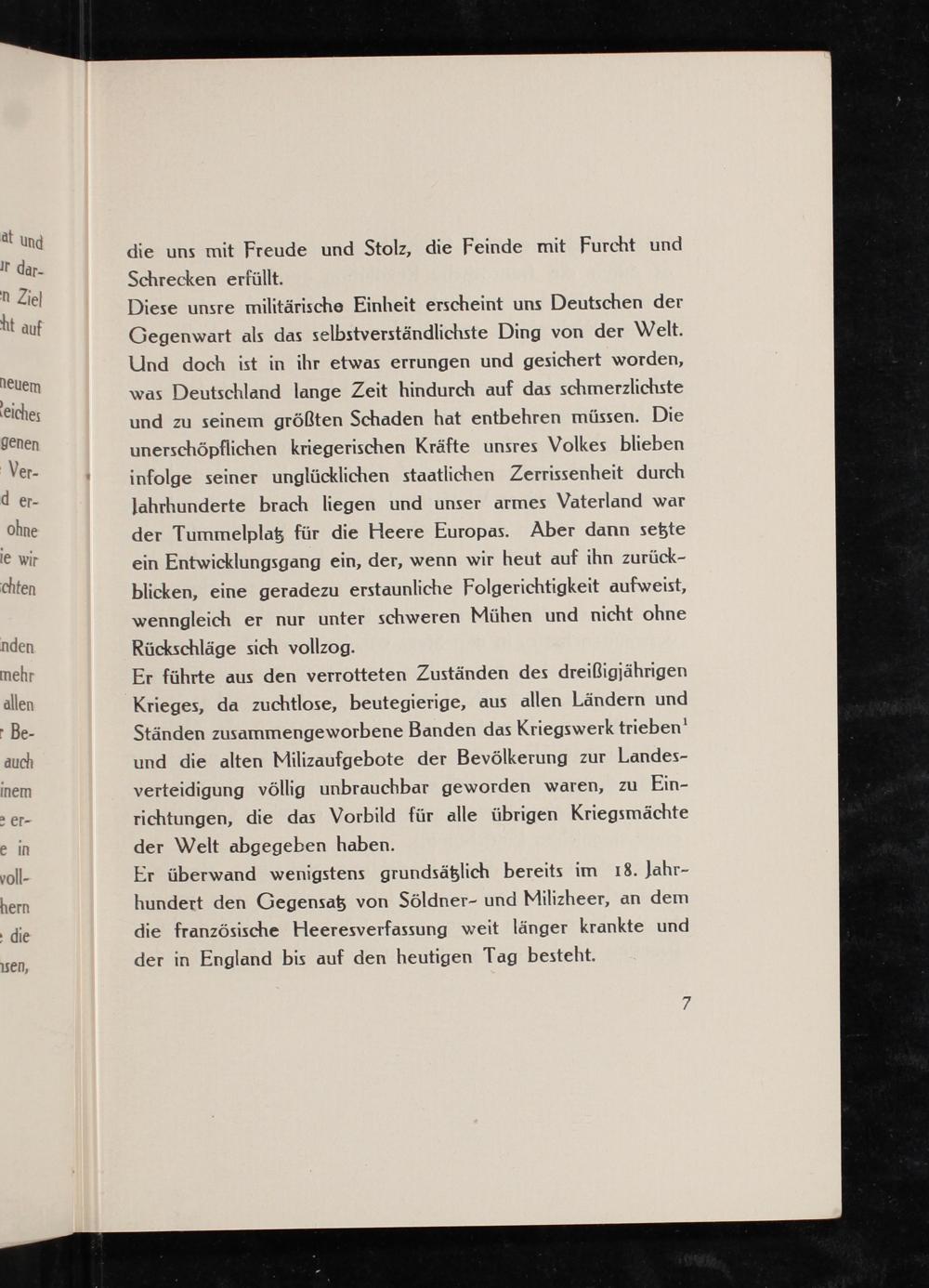 Diese unsre militärische Einheit erscheint uns Deutschen der Gegenwart als das selbstverständlichste Ding von der Welt. Und doch ist in ihr etwas errungen und gesichert worden, was Deutschland lange Zeit hindurch auf das schmerzlichste und zu seinem größten Schaden hat entbehren müssen. Die unerschöpflichen kriegerischen Kräfte unsres Volkes blieben infolge seiner unglücklichen staatlichen Zerrissenheit durch lahrhunderte brach liegen und unser armes Vaterland war der Tummelplatz für die Heere Europas. Aber dann setzte ein Entwicklungsgang ein, der, wenn wir heut auf ihn zurück- blicken, eine geradezu erstaunliche Folgerichtigkeit aufweist, wenngleich er nur unter schweren Mühen und nicht ohne Rückschläge sich vollzog.