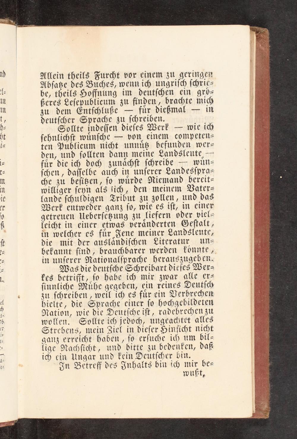 Allein theils Furcht vor einem zu geringen Abſaße des Buches, wenn ich ungriſch ſchrie- be, theils Hoffnung im deutſchen ein grd= ßeres Leſepublicum zu finden, brachte mich zu dem Entſc<hluße=- für dießmal=- in deutſcher Sprache zu ſchreiben.