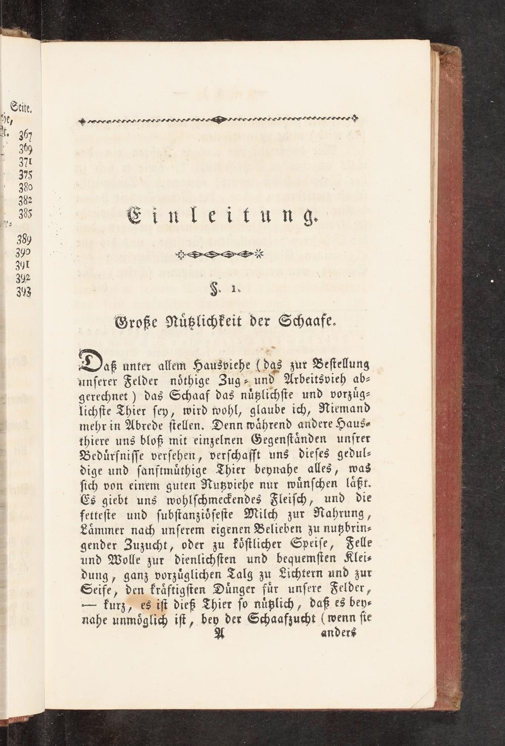 Das unter allem Hausviehe( das zur Beſtellung unſerer Felder nöthige Zug-. und Arbeitsvieh ab- gerechnet) das Schaaf das nüßlichſte und vorzüg- lichſte Thier ſey, wird wohl, glaube ich, Niemand mehr in Abrede ſtellen. Denn während andere Haus- thiere uns bloß mit einzelnen Gegenſtänden unſrer Bedürfniſſe verſehen, verſchafft uns dieſes gedul- dige und ſanftmüthige Thier beynahe alles, was ſich von einem guten Nußviehe nur wünſchen läßt. Es giebt uns wohlſchme>endes Fleiſch, und die fetteſte und ſubſtanziöfeſte Milch zur Nahrung, Lämmer nach unſerem eigenen Belieben zu nußbrin- gender Zuzucht, oder zu köſtlicher Speiſe, Felle und Wolle zur dienlichſten und bequemſten Klei- dung, ganz vorzüglichen Talg zu Lichtern und zur Seife, den kräftigſten Dünger für unſere Felder, --- furz, es iſt dieß Thier ſo nüßlich, daß es bey- nahe unmöglich iſt, bey der Schaafzucht(wenn ſie A anders