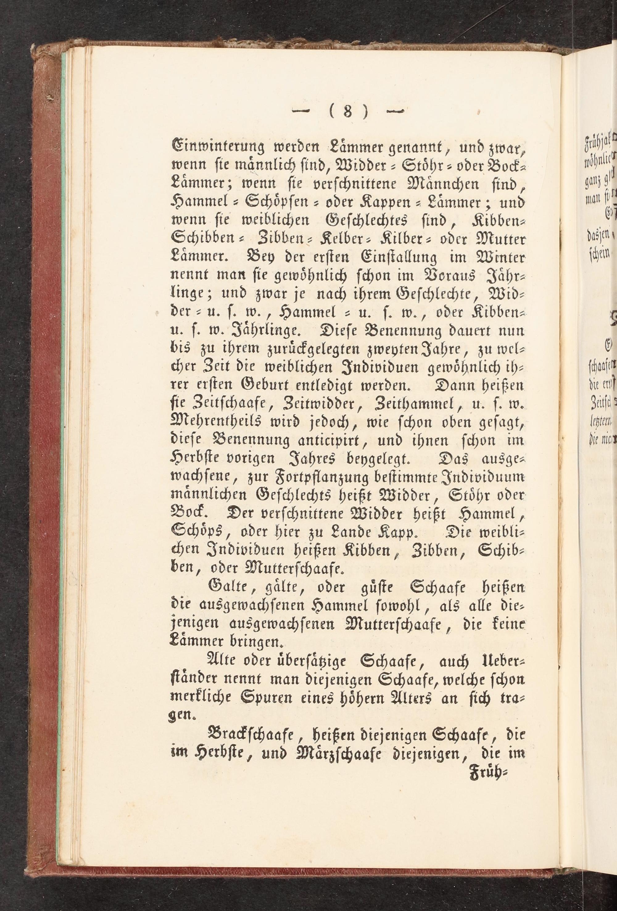Herbſte vorigen Jahres beygelegt. Das ausge- wachſene, zur Fortpflanzung beſtimmte Individuum männlichen Geſchlechts heißt Widder, Stöhr oder Bot. Der verſchnittene Widder heißt Hammel, Schöps, oder hier zu Lande Kapp. Die weibli- <en Individuen heißen Kibben, Zibben, Schib- ben, oder Mutterſchaafe.