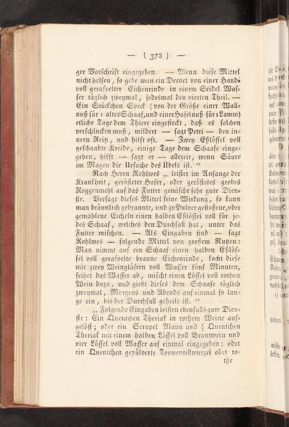 ger Vorſchrift eingegeben.= Wenn dieſe Mittel nicht helfen, ſo gebe man ein Decoct von einer Hands voll geraſvelter Eichenrinde in einem Seidel Waſ- ſer täglich zweymal, jedesmal den vierten Theil.=- Ein Stückchen Sveck(von der Größe einer Wall- nuß ſür 1 altesSchaaf,und einerHaſelnuß für1 Lamm) etliche Tage dem Thiere eingeſtet, daß es ſolchen verſchlucken muß, mildert== ſagt Petri= den in- nern Reitz, ind! il ft oft.= Zwey Eßlöffel voll geſ<haabte Kreide, einige Tage dem Schaafe einge- geben, hilft== ſagt er=- allezeit, wenn Säure im Magen die Urſache des Übels iſt.“