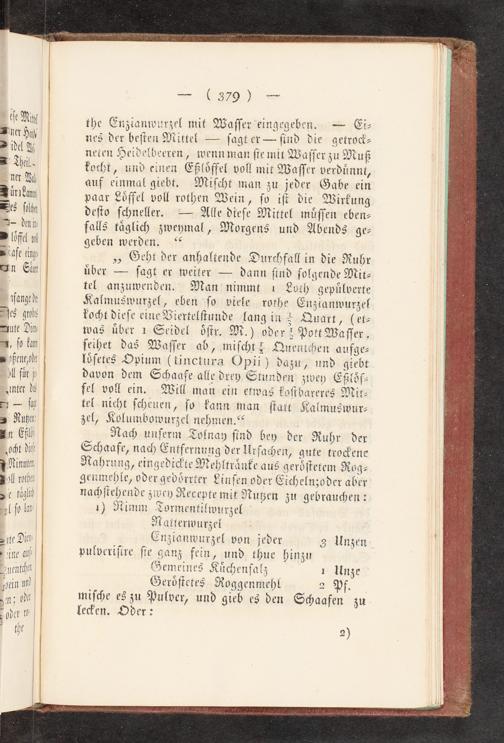 pl für js| davon dem Scaafe alle drey Stunden zwey Eßlöſ- „inter di fel voll ein. Will man ein etwas koſibareres Mit- Ei- fit| tel nicht ſcheuen, ſo kann man ſtait Kalmuswur- 3 Nutt zel, Kolumbowurzel nehmen.“| En Gli) Nach unſerm Tolnay ſind bey der Ruhr der „odht di Schaafe, nach Entfernung der Urſachen, gute tro&dene FNinuts Rahrung, eingedi>te Mehltränke aus geröſtetem Rog- "MENT genmehie, oder gevörrter Linſen oder Eichelnzoder aber 30 Höglid nachſtehende zwey Recepte mit Nutzen zu gebrauchen: El fo Im| 1) Jimm„Zormentilwurzel
