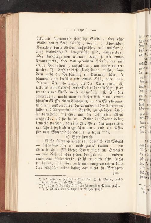 bekannte ſogenannte flüchtige Salbe, oder eine Salbe von 3 Loth Leindhl, worinn 2 QLuentc<en Kampher durc< Reiben aufgelöfet, und welcher 3 Loth Salmiakgeiſt beygemiſcht ſind, einzureiben, oder Umſchläge von warmem Kuhmiſt mit etwas Branntwein, oder von gekochtem Leinſaamen mit etwas Branntwein, aufzulegen, um ſolche zu zer- theilen.*) Erfolgt dieſe Zertheilung nicht, ſon- dern geht die Berhärtung in Eiterung über, ſo ſchmiert man dieſelbs mit etwas Ohl, oder unge- ſalzenen Fett, ſo lange, bis der Eiter zeitig iſt, welches man dadurch eutde>t, daß die Geſchwulſt an irgend einer Stelle weich anzufühlen iſt. Iſt das geſchehen, ſo macht man an dieſer Stelle mit einem ſcharfen Meſſer einen Einſchnitt, um den Eiter heraus- zulaſſen, und verbindet die Wunde mit der Terpentin- ſalbe aus Terpentin und Eygelb, zu gleichen Thei- len vermiſcht,**) oder mit der bekannten Bley- weißſalbe, bis ſie heilet. Sollte der Brand dabey bemerkt werden, ſo rath Hr. Petri den angegriffe- nen Theil ſogleich wegzuſchneiden, und ein Pfla- ſier von Storaxſalbe darauf zu legen***). q) Beinbruch. Nicht ſelten geſ<ieht es, daß ſich ein Schaaf