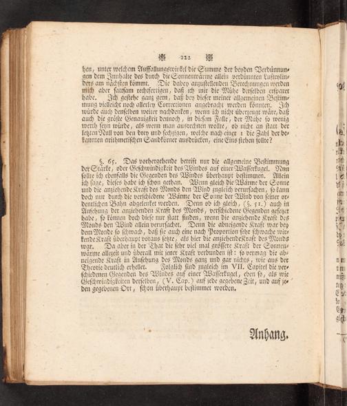 &. 65. Das vorbergchende betrifé nur die allgemeine Seftimmung der Otarte, oder GefhwindigÉcit des ABindes auf diner LafferEugel. Mnn folite ich chenfails die Gegenden des MBindes überbaupt beftimmen, ich fage, dicfes babe ich fbon getban, Aenn gleich Die ASarme der Sonne uno die angichende Kraft des Monds den ABind sugleich verurfachen, fb Éann doch nue Durch Die verfchiebene YBarme der Œvnne der ABind von feiner ot dentiihen Sabn abgelenËet werden, Oenn ob ich gfeidh, CS. sr.) auch it DHnfebung der anichenden Kraft des Monds, verfchicdene Segenden gefesct babe, fo Éonnen Doch biefe nur ftatt finden, tvenn Die angichende Kraft Des Ronde den ABind allein verurfachet, Denn die abneigende Kraft war ben den Monde, dab fie auch eine nach Proportion febr fhivache wirz Fende Rraft uberbauvt voraus fete, als bier Die angiebendeRraft Des Donds