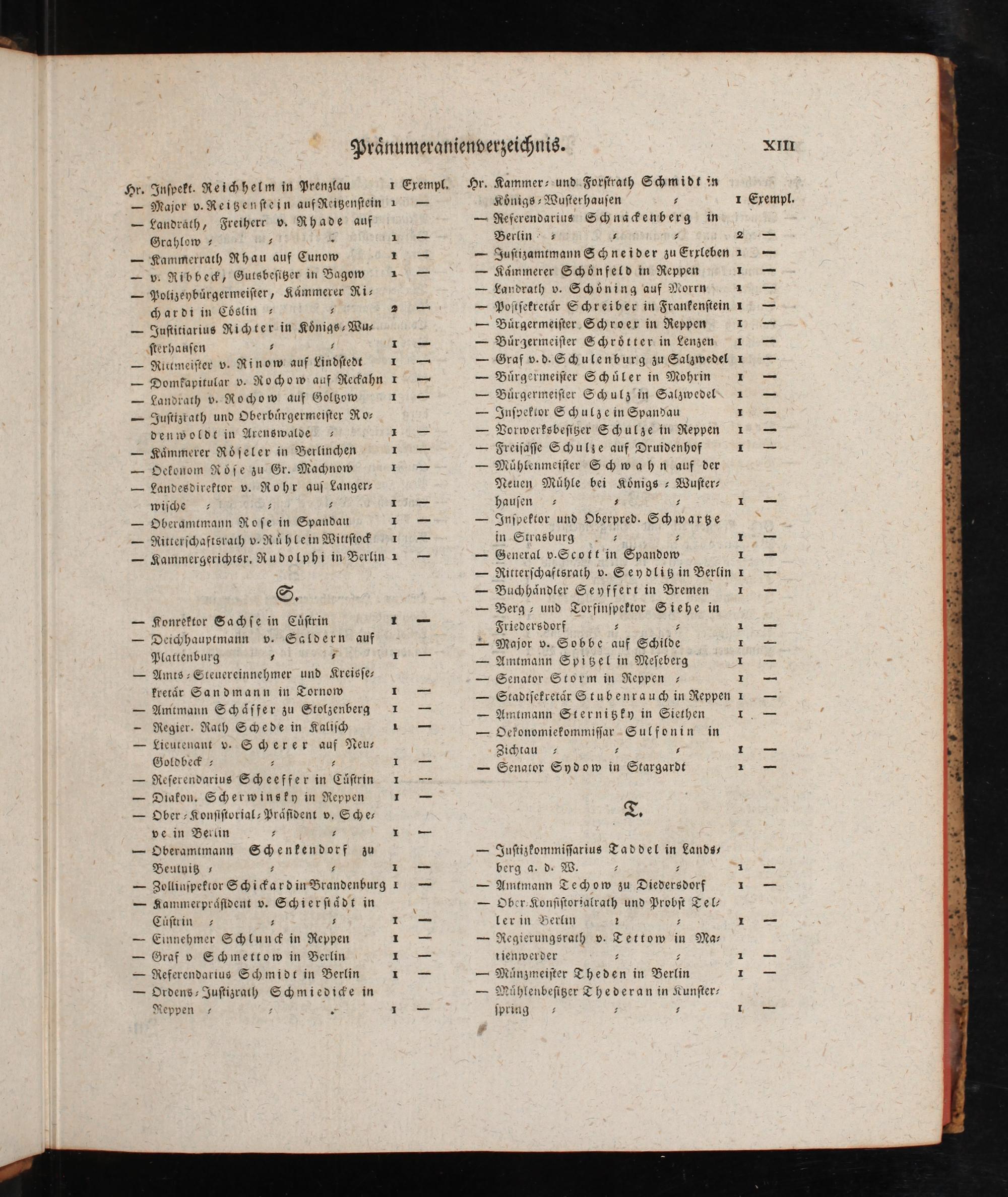 Hr. Juſpekt. Reic<helm in Prenzlau 1 Exempl. Hr. Kammer-:und..Forſtrath Schmidt in -- Major v.Reißenſtein aufReitenſtein 3= Kynigs- Wuſterhauſen: I Exempl, =- Fandräth, Freiherr v. Rhade auf= Referendarius Schns>enberg in