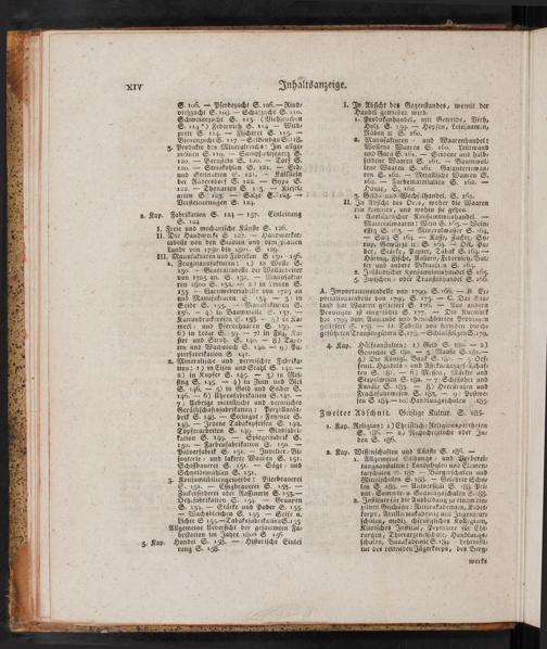 130,="Generaltavelle der Woltlarveiter von 1725 an.'S. 132,= Neanufaktu- ren 1800 S. 132.= 2) in Leinen S. 13Z= Garnwebertabei!e von 1725 an und Manufakiuren S. 134.= z) in Seide“ S. 135.=='Manufakturen S. 736.= 4) in Baumwoile-S. 137.= KattundruFereien S. 138.= 5) in Ka/ meel- und Pferdehaaren S. 139.= 6) in Leder S.:539.= 7).in Filz, Ka- ſtor und Stroh. S. 140.= 8) Tape- ten und Wachstuch S. 140.= 9) Pa- pierfavrikatrion. S. 141. O Mineralijcde und„vermiſchte Fabrika tion: 1) in Eijen und Stahl S. 142.-=- 2) in Kupfer S. 145:= 3) in Meſ- ſing S. 145.= 4) in Zinn und Blei S. 146.= 5) in Gold und Silber S, 146.-- 6) Uhrenfabrifation S. 147.= 7) YUebrige metalliſche und vermiſchte Geräthſchaftsfabrikation: Porzellanfa- brik S. 148.= Steingut- Fayence S. 143.= Irdene Tabakspfeifen S. 149. Töpferarbeiten S. 149.-- Glasfabri- kation S. 149.= Spiegelfabrik S. 150.= Farbenfabrifation S. 150.== Pulverfabrik S. 152,-- Juvelier- Bi- jouterie- und lakirte Waaren S. 151. Schiſſbauerei S.- 151.= Säge- und Schneidemäuhlen S- 151. Konjumtibiliengewerbe: Bierbrauerei E. 151.=- Ejjigbrauerei S. 153.= Zuerſiederei oder Raffinerie S. 153,= Deh.fabrikation S. 154.== Graupen