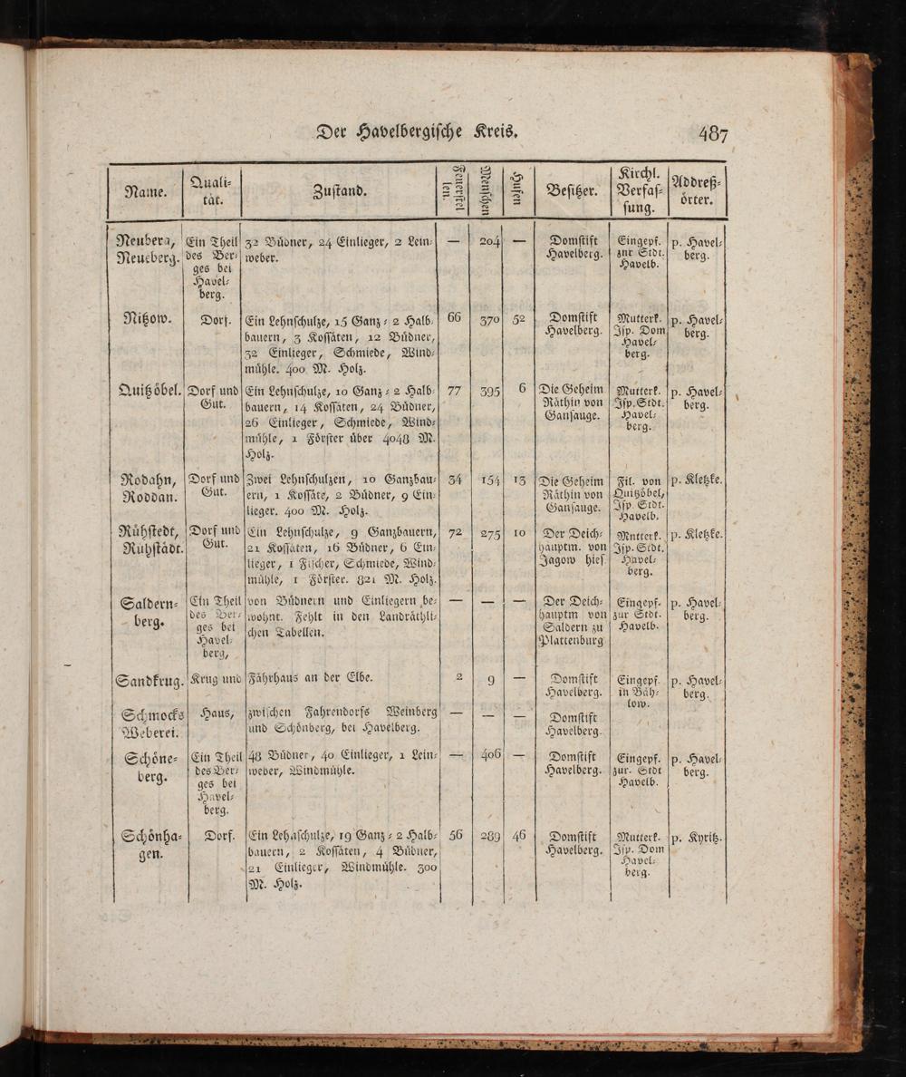 Quißöbel.| Dorf und| Ein Lehnſchulze, 10 Ganz- 2 Halb-| 77| 395| 6| Die Geheim| Mutterk.|p. Havel-