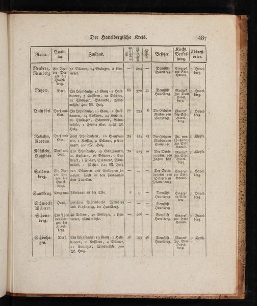 Rodahn,|Dorf und| Zwei Lehnſchulzen, 20 Ganzbau-| 34| 154| 15|Die Geheim| Fil. von|P- Klekfe. Roddan.| Out- lern, 1 Koſſäte, 2 Büdner, 9 Ein- Räthin von 0 lieger. 400 M. Holz. Gauſauge.| Ip. Slot Javeib, Rühſtedt, orf und|Ein Lehnſchulze, 9 Ganzbauern,| 72| 275| 10| Der Deich-| Mntterk.|p- Klekfe. | Ruhſtädt. Gut.|51 Koſſaten, 26 Büdner, 6 Em-|- hauptm. von| Jip. Sedt. | lieger, x Fiſcher, Schmiede, Wind- Jagow hief.(2 0| mühle, 1 Förſter. 821 M. Holz. 9.| Saldern-|Ciu Theil|von Büdnern und Einliegern be-]=-|=-|==| Der Deich-| Eingepf-|p. Havel-: 8; y des Der- wohnt. Fehlt in den Landräthli- hauptm von| zur Stdt.| berg..| berg. ges bei den ELIE Saldern zu| Havelb.| Havel:+ Plattenburg| berg, Sandkrug. Krug unv|Fährhaus an der Elbe. 2 9|- Siniſe Eingepf. p- Havel- Havelberg.| in Bäh- berg. de E 23 Ug Di(ow. Schmocks| Haus, zwiſchen Mo aber ebpmut;-|-|-| Domſtift I3Beberei. und Schönberg, bei Havelberg. Havelberg. Schöne-|Ein Theil|48 Büdner, 40 Einlieger, 3 Lein-|=| 406|=-| Domſtift| Eingepf.|p. Havel- b des Ber-|weber, Windmühle. Havelberg.|zur- Stdt| berg. 455 ges bei j Havelb. Havel- berg. Schönha-| Dorf.|Ein Lehaſchulze/ 19 Ganz- 2 Halb- 56| 2389| 46| Domſtift| Mutterk.|p. Kyriß. gen. bauern, 2 Koſſäten, 4 Büdner,| Havelberg. Iſp- 2710 Jor Einlieger, Windmühle. Z00|:"Den M. Holz-:;