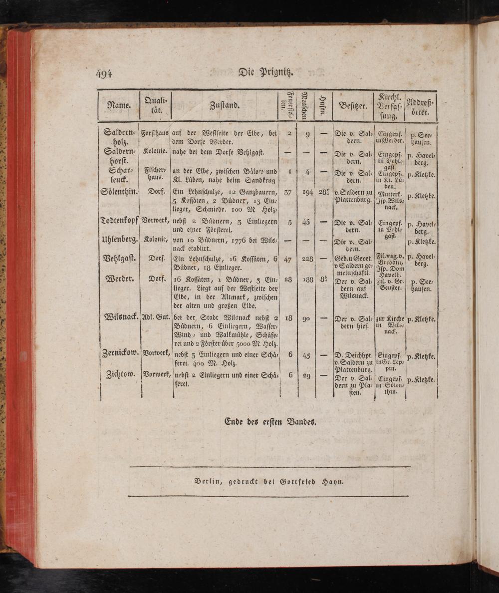 494 &); 3 aw Quali- AE 17 GEE SEGHES EE Zuſtund, 22(S| SD| Beſißer.| Verfaſ- ng je. E12[.-|. fung;: | 506 Saltldern-|Serſchaus auf der Weſtſeite der Elbe, bei, 2| Oj| Die v. Salt? Eingepig P- See- -holz.[dem Dorfe Werder. dern.„jinWerder.| haujen. Saldern- Kolonie. nahe bei dem Dorfe Vehlgaſt. 4| 57 1Die'v---Sal-| Gingepf,|p. Havel: horſt.' dern, in Vehl-/|* ber Schar-| Fiſcher-| an der Elbe, zwiſchen Bälow und| 1| 4|=|Die vy. Sal- Ee FN. ; I;«|. De I leut. haus.| Kl. Lüben, nahe beim Sandkrug| dern. jin Ki."Sakdiuiel HER 4.0 8 5 n. Sölenthin.| Dorf.| Ein Lehnſchulze, 12 Ganzbauern, 37| 194 283|v.Saldern zu| 9Mutrterk.|. Klexfe 5 Koſſäten, 2 Büdner, 13 Ein- Plattenburg.| Jſp.Wils- PEG lieger, Schmiede. 100 M Holz- na&, Todtenkopf Vorwerk, nebſt 2 Bädnern, 3 Einliegern! 5| 45|=|Die vy. Sal-| Eingepf. p- Havel- und einer Förſterei. dern. in Behl-| herg. Uhlenberg. Kolonie, von 10 Büdnern, 1776 bei Wils-|==|=-|=(Die v. Sal- 2 P- Klekfe. nac etablirt. vein.? Vehlgaſt.| Dorf.| Ein Lehnſchulze, 16 Koſſäten, 6 47| 228|=„Geb.u Gevet. BICNSEN, 35.58 Büdner, 18 Einlieger.| vSaldernge-| 4) Dom| 7 Werder.| Dorf.|16 Koſſaten, z Büdner, 3 Ein-' 28 ER fbr 4 IE 81: 2 12957 ten, 16) 4 2188| 83|Der v. Sal:| Fil. v. Gr.| p. See- lieger. Liegt auf der Weſtſeite dev| dern auf| Beuſter.| haujen. Elbe, in der Altmark, zwiſchen Wilsnac>. der alten und großen Elbe. Wilsnac>. Adt. Gut. bei der Stadt Wilsnack nebſt 2| 18| 90|=[Der v. Sal-|zur Kirche'p. Klette, Büdnern, 6 Einliegern, Waſſer-| dern hieſ. jin Wils-| Wind- und Walkmühle, Schäfe-| na» rei und 2 Förſter über 5006 M. Holz.| Zernickow.| Vorwerk, nebſt 3 Tinliegern und einer Schä, 6| 45|=|D. Deichhpt.| Eingepf.'p. Klekke. ferei. 4009, M. Holz.| Ne zu|inGr. Lep- |.gt|;; attenburg. pin.( WW.| EF E. I uE | Zichto|Vorwerk, nebſt 2 Einliegern und einer Schä 6| 29 Der y. Sal»| Eingepf.!p. Klehte.| | ferei.' dern zu Pla-|in Söten- ||| ſien. thin.||
