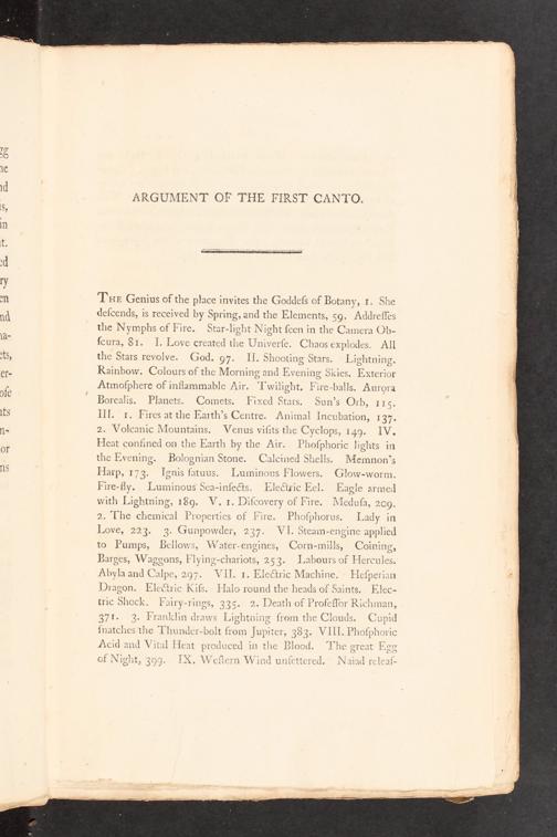 "Tar Geninus of the place invites the Goddeſs of Botany, 1. She deſcends, is received by Spring, and the Elements, 59. Addrefles the Nymphs of Fire. Star-light Night ſeen in the Camera Ob- ſcura, 81. 1. Love created the Univerſe. Chaos explodes. All thie Stärs revolve. God.“97. I. Shooting Stars. Lightning. Rainbow. Colours of the Morning and Evening Skies. Exterior Atmoſphere of inflammable Air. Twilight. Fire-balls. Aurora Borealis. Planets. Comets. Fixed Stars. Sun's Orb, TEIGE UI. 1. Fires at the Earth's Centre. Animal Incubation, ND 277 2. Volcanic Mountains. Venus viſits the Cyclops, 149. IV. Heat confined on the Earth by the Air. Phoſphoric lights in the Evening. Bolognian Stone. Calcined Shells. Memnon?s Harp, 173. Ignis fatuus. Luminous Flowers. Glow-worm. Fire-By. Luminous Sea-infe&s. Eledtric Eel. Eagle armed with Lightning, 189. V. 1. Diſcovery of Fire. Meduſa, 209. 2. Ihe chemical Properties of Fire. Phoſphorus. Lady in Love, 223. 3. Gunpowder, 237. VI. Steam-engine applied to Pumps, Bellows, Water-engines, Corn-mills, Coining, Barges, Waggons, Flying-chariots, 253. JLabours of Hercules. Abyla and Calpe, 297. VII. 1. Ele&ric Machine.- Heſperian Dragon. Ele&ric Kiß. Halo round the heads of Saints. Elec- tric Shock, Fairy-rings, 335. 2. Death of Profeſſor Richman, 371. 3. Franklin draws Lightning from the Clouds. Cupid ſnatches the Thunder-bolt from Jupiter, 383. VIII. Phoſphoric Acid and Vital Heat produced in the Blood. The great Eog of Night, 299. IX, Weſtern Wind unſettered. Naiad releaſ-