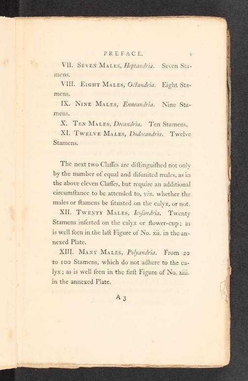 The next two Claſſes are diſtinguiſhed not only by the number of equal and diſunited males, as in the above eleven Claſſes, but require an additional circumſtance to be attended to, v/z. whether the males or ſtamens be ſituated on the calyx, or not.