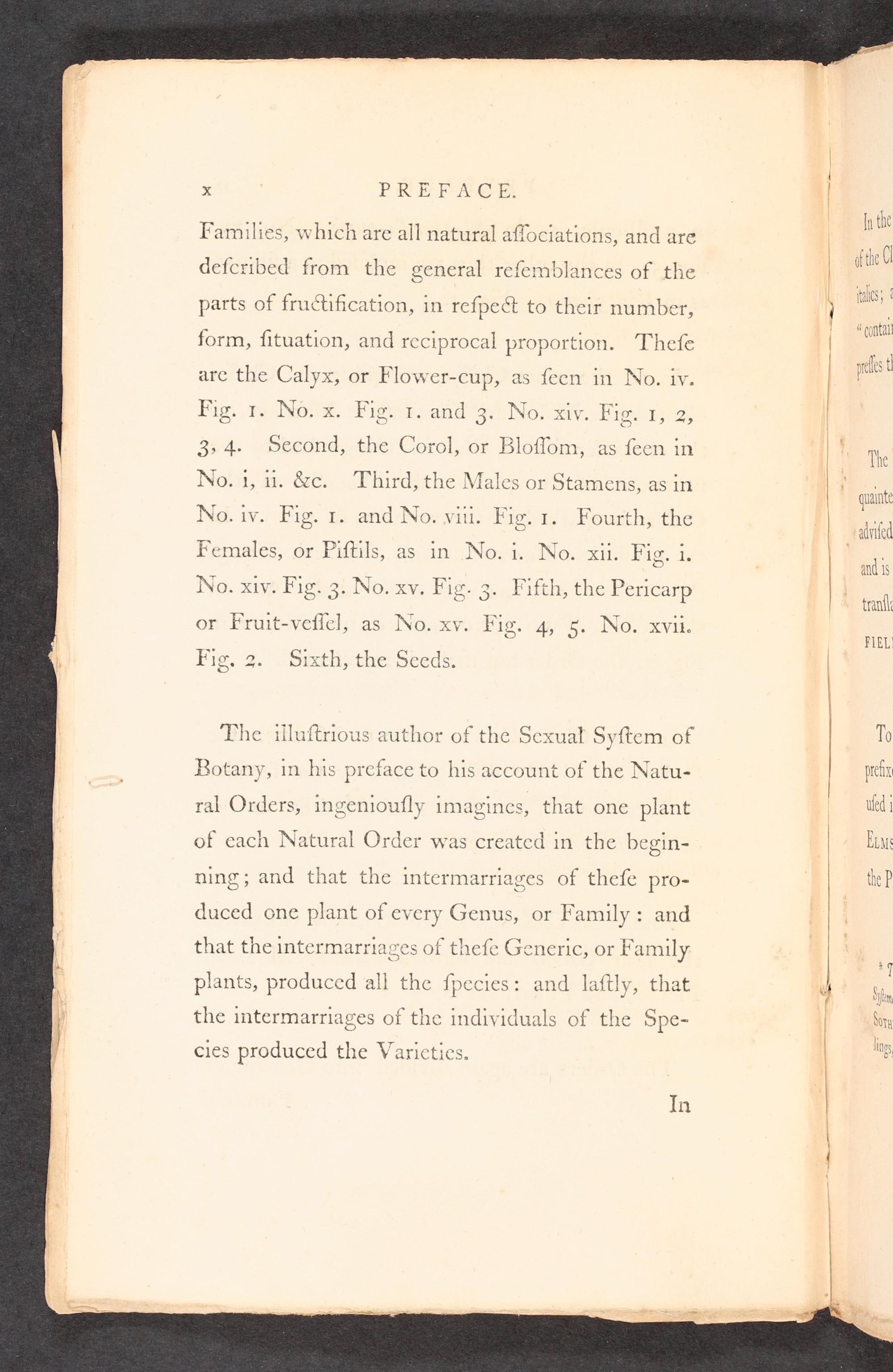 Botany, in his preface to his account of the Natu- ral Orders, ingeniouſly 1magines, that one plant of each Natural Order was created in the begin- ning; and that the intermarriages of theſe Pro- duced one plant of every Genus, or Family: and that theintermarriages of theſe Generic, or Family plants, produced all the ſpecies: and: laſtly, that the intermarriages of the individuals of the OPC
