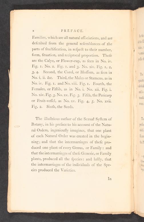 Families, which are all natural aſſociations, and are deſcribed from the general reſemblances of the parts of fructification, in reſpect to their number, form, ſituation, and reciprocal proportion. Theſe are the Calyx; or Flower-cup, as ſeen in No. iv. Fig. 19 Noi. Fie.1.00073:0No0/.20%. Fie 1,2 35 4:"Second; the Corol, 6r Bloſſom."as ſeen in No. 1, 8.&c. Third, the Males or Stamens, as in Na. 1v.:- Eid. 14 and No: vii. Fign1.. Fourth; the Females, or Piſtils, as in No. 1. No. zii. Fis: 44 N6. 31 Figt 34 Now Vig 3. Filth, the-Pericarp or Fruit-veſſel, as No. xv. PT. 042/ 5 NO XV