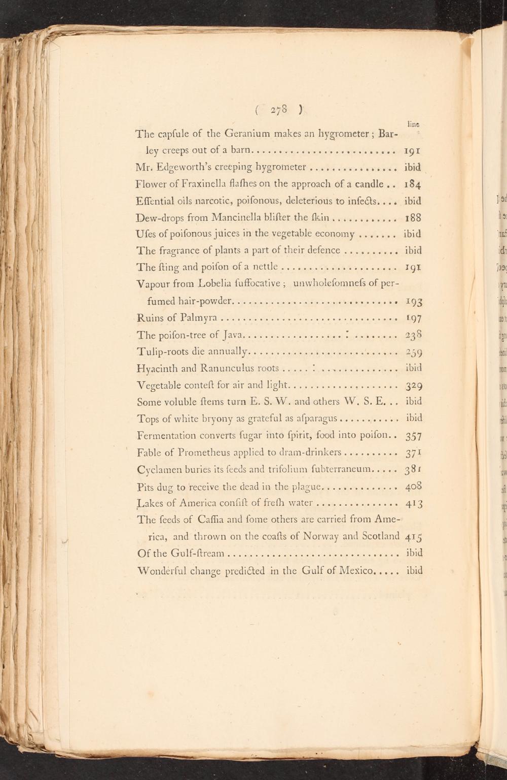 Some voluble ſtems turn E. S. W. andoothers W. S.E... Tops of white bryony as grateful as aſparaguS.....+/...>-» Fermentation converts ſugar into ſpirit, food into poiſon.. Fable of Piometheus applied to dram-drinKers...--.---» Cyclamen buries its ſeeds and trifolium ſubterraneum..... Pits dug to receive the dead in the plagyC....»».»+»+-»-+--» Lakes'of America confiſt ot freih Water...---.-.---.»» The ſeeds of Caſlia and ſome others are carried from Ame-