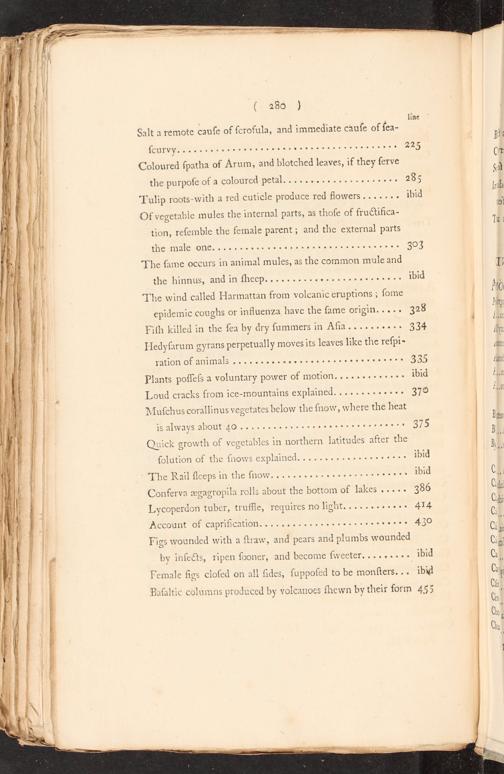 (4.2800...) 3: line Salt a remote cauſe of ſcrofula, and immediate cauſe of ſea- (SWINGER EE R EE SR HEI Sn R nennen PDE Coloured ſpatha of As m, and blotched leaves, if they ſerve the purpoſe of a coloured petal.«+..+ob++bv+ber er» 2385 "Tulip roots-with a red cuticle produce red flowers..«-++ Ibid Of vegetable mules the internal parts, as thoſe of frudifica- tion, reſemble the female parent; and the external parts INE NATE LONE a ee u nel ee SIe ee ue a ei eie ei 305 “The ſame occurs in animal mules, as the common mule and the hinnus, ANG IN INECD.--»-----«.z u-----.--....=<- 1bid The wind called Harmattan from volcanic eruptions; ſome epidemic coughs or influenza have the ſame origin..«+ 328 Fiſh killed in the ſeca by dry ſummers in Alia...+.+++-» 334 Hedyſarum gyrans perpetually moves its leaves like the reſp1- EGO OE ANUNANS+ 1. ee we eee u es He ee Ene 3 Plants poſſeſs a voluntary power OF ANOLIOM 2a.57n when 000200 205 M INN Loud cracks from ice-mountains explained....+»+»-»---» 379 Muſchus corallinus vegetates below the ſnow, 0 the heat is always abOUL4O+.+++. SSEN I NE BEAGERSEREEES DE ZI Quick growth of vegetables in northern latitudes after the ſolution of the WE ENPIAMEd. GEN I ALNETEGO 1bid -"The Rail ſleeps in the noW..«+.».«--»-»»-5---»»**»***»* 1bid Conferva egagropila rolls about the bottom of lakes«---- 386 Lycoperdon tuber, truffle, requires no light.«+..++»»+»..» 414 [A CCOUNE OF CAPKIICANON re+10: eee eee een u ee vez eee er IADO Figs wounded with a ſtraw, and pears and plumbs wounded by inſects, ripen ſooner, and become GEHE ESI Female figs cloſed on all ſides, ſuppoſed to be monſters... ibid