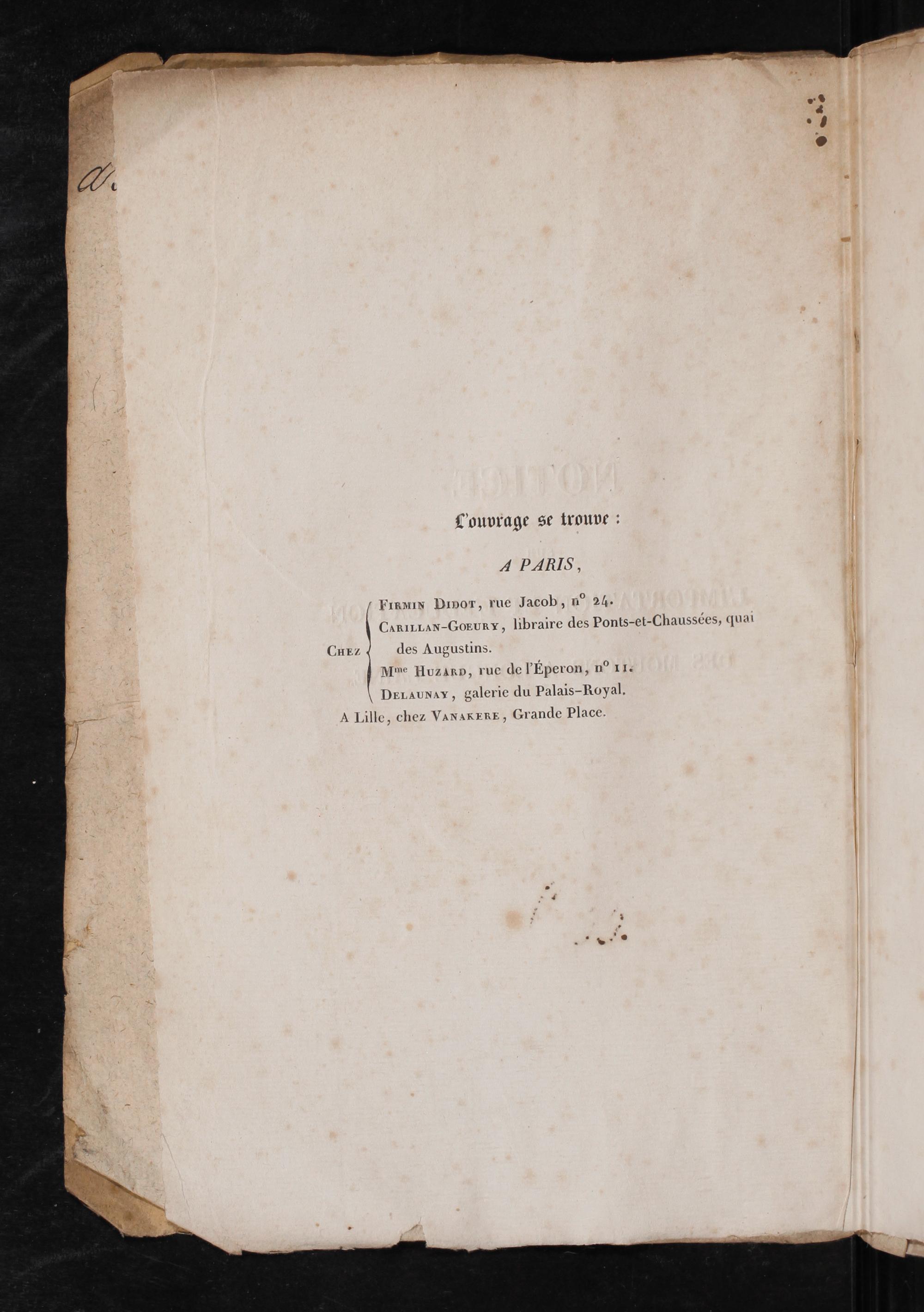 s Fremux Dior, rue Jacob, n° 24. Carmizzan-Goury, libraire des Ponts-et-Chaussées, quai CHEZ des Augustins. Me Huzar», ruc de l'Éperon, n° 11: Drzaunay, galerie du Palais-Royal.