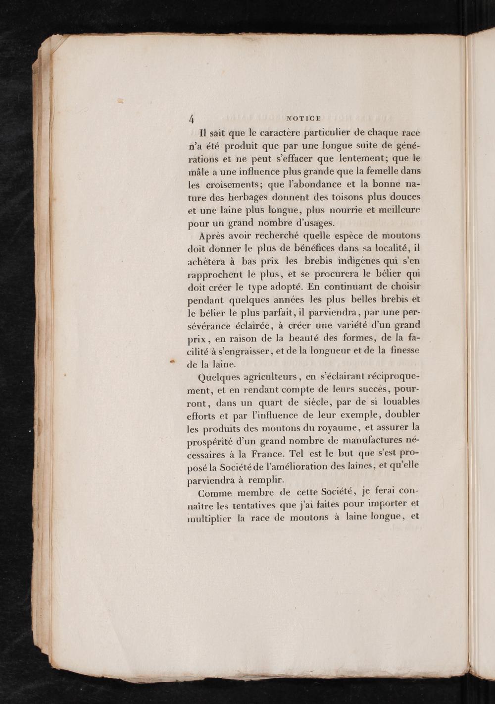 Quelques agriculteurs, en s’éclairant réciproque- ment, et en rendant compte de leurs succés, pour- ront, dans un quart de siècle, par de si louables efforts et par l’influence de leur exemple, doubler les produits des moutons du royaume, et assurer la prospérité d’un grand nombre de manufactures né- cessaires à la France. Tel est le but que s’est pro- posé la Société de l'amélioration des laines, et qu’elle parviendra à remplir.
