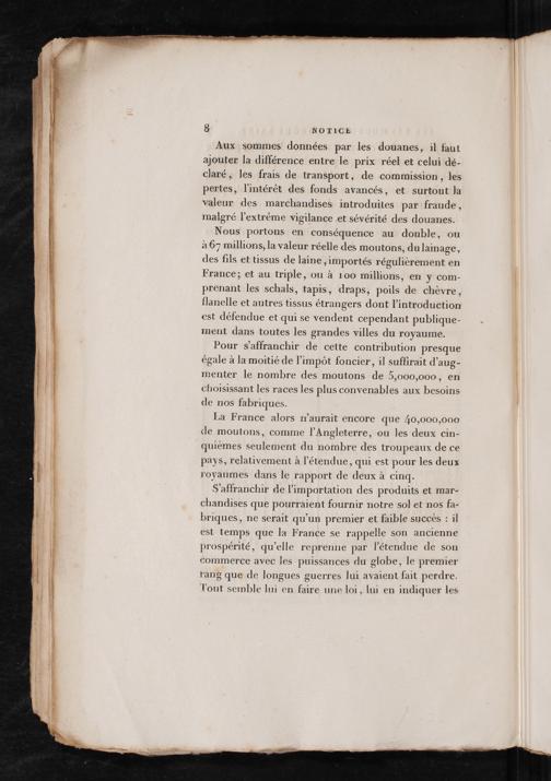 Nous portons en conséquence au double, ou à 67 millions, la valeur réelle des moutons, du lainage, des fils et tissus de laine, importés régulièrement en France; et au triple, ou à 100 millions, en y com- prenant les schals, tapis, draps, poils de chèvre, flanelle et autres tissus étrangers dont l'introduction est défendue et qui se vendent cependant publique- ment dans toutes les grandes villes du royaume.