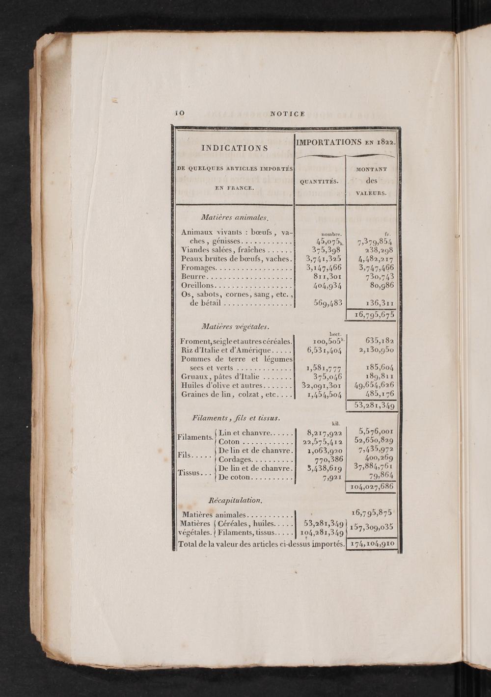 IMPORTATIONS En 1822. INDICATIONS RSR DE QUELQUES ARTICLES IMPORTÉS MONTANT QUANTITÉS. des EN FRANCE. VALEURS. Matières animales.