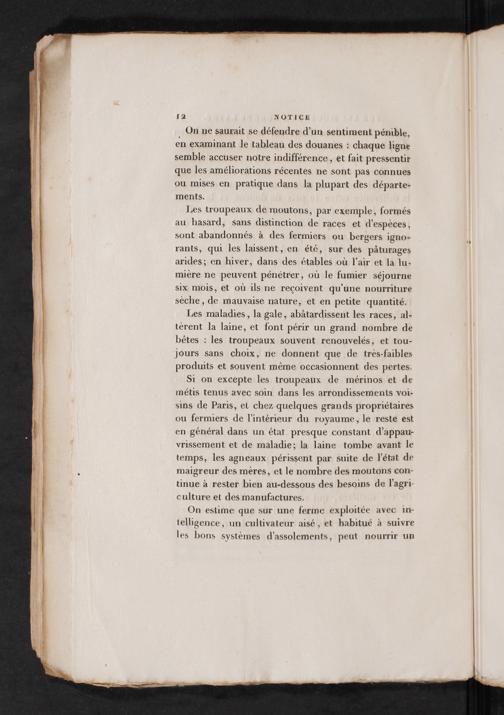 Si on excepte les troupeaux de mérinos et de métis tenus avec soin dans les arrondissements voi- sins de Paris, el chez quelques grands propriétaires ou fermiers de l’intérieur du royaume, le reste est en général dans un état presque constant d’appau- vrissement et de maladie; la laine tombe avant le temps, les agneaux périssent par suite de l’état de maigreur des mères, et le nombre des moutons con- tinue à rester bien au-dessous des besoins de l'agri- culture et des manufactures.