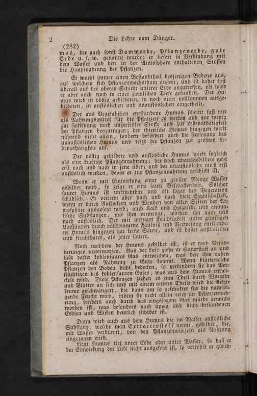 Der völlig gebildete und auflösliche Humus wirkt ſogleich als eine kräftige Pflanzennahrung 3 der noch unausgebildete geht erſt nach und nach in jene über; und der unauflvosliche muß exſt auflvslich werden, bevor er zur Pflanzennahrung geſchickt iſt.
