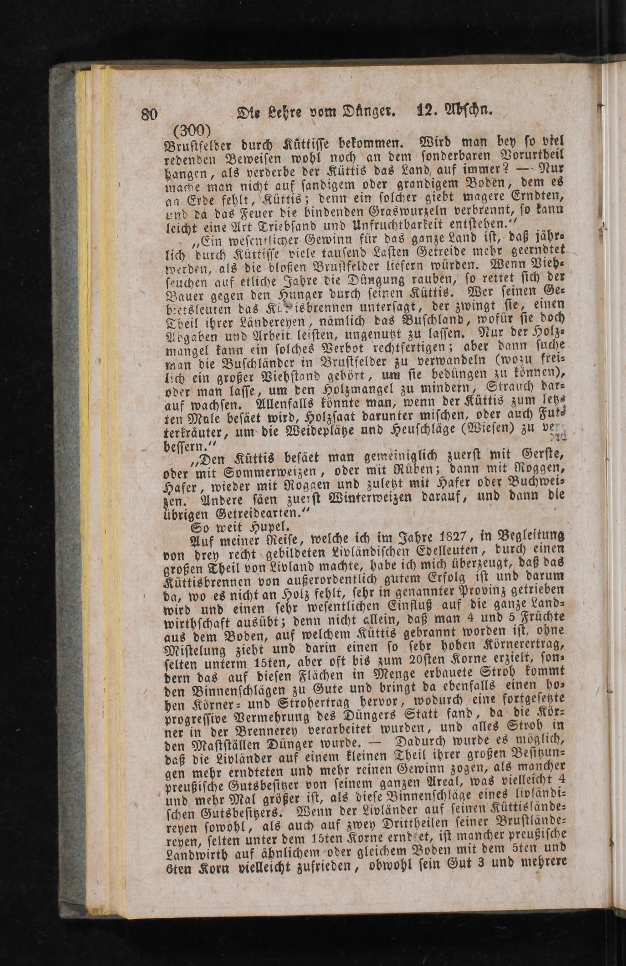 Auf meiner Reiſe, welche ich im Jahre 1827, in Begleitung von drey recht«gebildeten Livländiſchen Edelleuten, burd) einen großen Theil von Livland machte, habe ich mich überzeugt, daß das Küttisbrennen von außerordentlich gutem Erfolg iſt und darum da, wo es nicht an Holz fehlt, ſehr in genannter Provinz getrieben wird und einen ſehr weſentlichen Einfluß auf die ganze Lands wirtbhſchaft ausübt 3; denn nicht allein, daß man 4 und 5 Früchte aus dem Boden, auf welchem Küttis gebrannt worden iſt, ohne Miſtelung zieht und darin einen ſo ſehr hohen Körnerertrag, ſelten unterm töten, aber oft bis zum 20ſten Korne erzielt, ſon» dern das auf dieſen Flächen in Menge erbauete Stroh kommt den Binnenſchlägen zu Gute und bringt da ebenfalls einen ho» hen Körner- und Strohertrag hervor, wodurd eine fortgeſetzte progreſſive Vermehrung des Düngers Statt fand, da die Kür- ner in der Brennerey verarbeitet wurden, und alles Stroh in den Maſtſtällen Dünger wurde,= Dadurch wurde es möglich, daß die Livländer auf einem kleinen Theil ihrer großen Beſihun= gen mehr erndteten und mehr reinen Gewinn zogen, als mancher preußiſche Gutsbeſiter von ſeinem ganzen Areal, was vielleicht 4 und mehr Mal größer iſt, als dieſe Binnenſchläge eines livländi- ſchen Gutsbeſizers. Wenn der Livpländer auf ſeinen Küttislände- reyen ſowohl, als auch auf zwey Drittheilen ſeiner Bruſtlände- reyen, ſelten unter dem löten Korne erndret, iſt mancher preußiſche Landwirth auf ähnlichem"oder gleichem Boden mit dem 5ten und 6ten Korn vielleicht zufrieden, obwohl ſein Gut 3 und mehrere