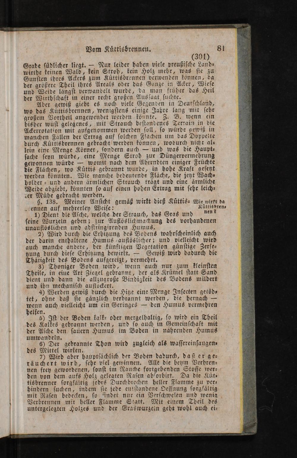 7) Wird aber hauptſächlich der Boden dadurch, daß er ge- räuchert wird, ſehr viel gewinnen. Alle die beym Verbren- nen frey gewordenen, ſonſt im Nauche fortgehenden Stoſfe wer- den von dem aufs Holz gelegten Raſen abſorbirt. Da die Küt» tisbrenner ſorgfältig jedes Durchbrechen heller Flamme zu ver: hindern ſuchen, indem ſie jede entſtandene Oeffnung ſorgfältig mit Raſen bede>en, ſo“indet nur ein Verſchwelen und wenig Verbrennen mit heller Flamme Statt. Mit einem Theil. des untergelegten Holzes und der.Sraswurzein geht wohl auch ei: